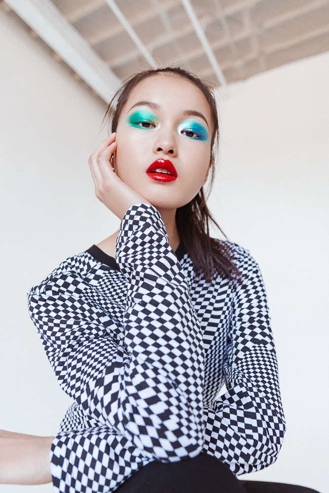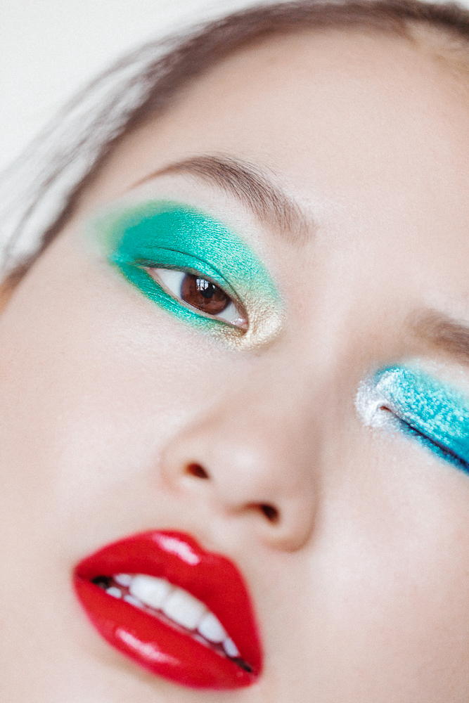 Make Up For Ever Wet Makeup in Bright Green, Fuchsia, and Petrol mixed with MAC’s Mixing Medium for the fluorescent liner. The black eyeliner was done with Diorshow Art Pen. On the brows is Dior's All-in-Brow 3D and for lips, Emi used Dior Addict Lip Glow in 001.