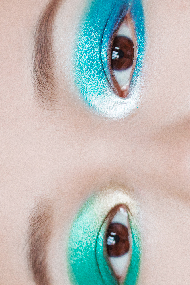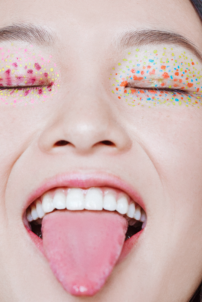 For this mismatched eye, Emi used Make Up For Ever Fluo Night Pigment in Fuchsia, Yellow, Green, and Purple mixed with MAC Mixing Medium.