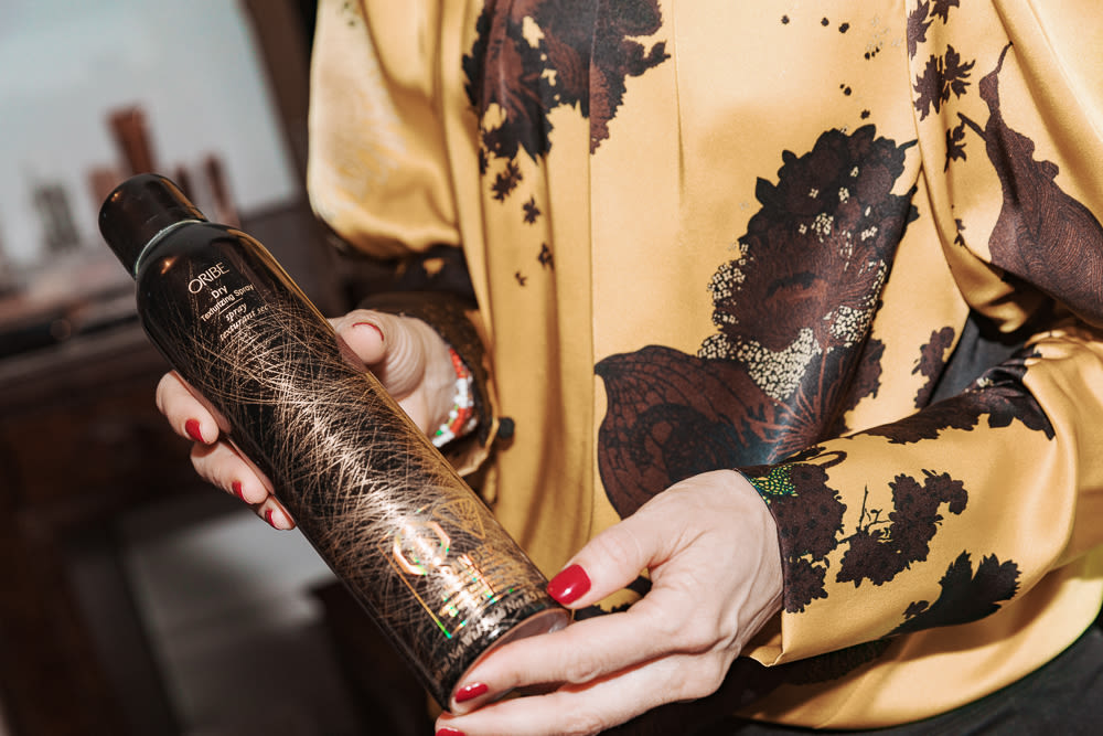 I use the Signature Shampoo and the Gold Lust Conditioner from Oribe. I have curly hair, but I blew it out because I’m going to a party tonight. Every once in a while, I use Phyto's Phytolium Shampoo which cleanses the scalp. I love the Gold Lust Dry Shampoo from Oribe. I use it on day 3 because if I wash my hair too often, it gets too dry.
