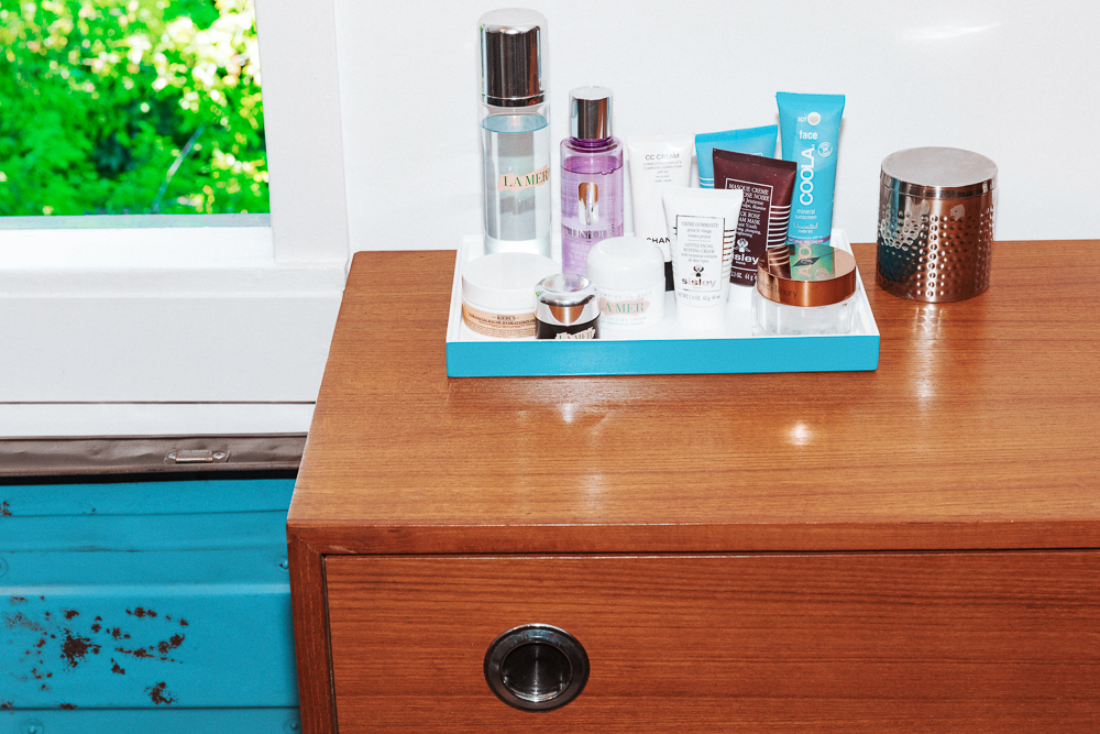 I’ve made a shift to using less product because I don’t want to strip away what’s naturally on my face. I’ll exfoliate, but not everyday. I’m starting to use cream exfoliators at night. While I sleep, it kind of sloughs the skin and doesn’t have a harsh effect. I also use Sunday Riley Good Genes which gently exfoliates. I just started using a La Mer Cleanser that I’m really enjoying. It’s a liquid cleanser that I use on a cotton pad. It takes everything off and it feels really nice. I like cleansers you can use on dry skin and I prefer this to an oil cleanser. I use the Tata Harper Eye Cream and sometimes the Skinceuticals one. I also use the Skinceuticals C E Ferulic Serum–it’s kind of amazing. I layer my sunscreen. I use the tinted moisturizer from Kiehl's that has SPF 50 and then I’ll put on the CC Cream from Chanel that’s also SPF 50. Somebody told me that using the CC Cream as my sunscreen wasn’t enough. I have very pale skin and tend to get sunspots and sun damage that I’m trying to reverse. I just did Fraxel two days ago, and my skin looks alright. This was my third one. Dr. Sandy Skotnicki is the best dermatologist. A lot of the things I do come from her, like my cleansing routine. Her whole concept is that we have all these things on our skin that we don’t necessarily want to scrub off. You need to get clean if you’re dirty, but we really put way too much on our body and our face. It’s about paring it off to the essentials.