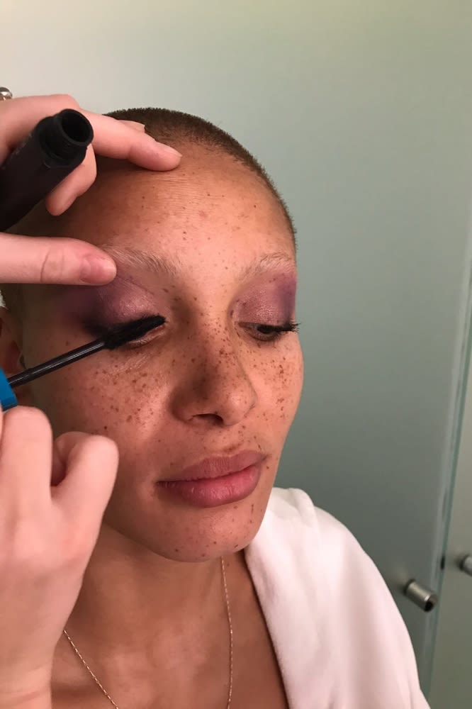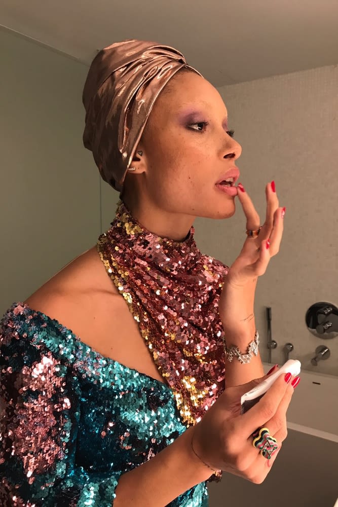 Adwoa called me on the way to say that Stephen Jones had made her a turban, and I immediately thought of Diana Ross in Mahogany. Diana Ross always had a delicate wash of color on her eyes in this film... Adwoa’s got a similar shaped eye, so I thought we should use color in this very ‘70s way while still keeping it modern. I used an old YSL palette of mine in Surrealiste, which is a collection of purples and one lime green. I primed with Nars Smudge Proof Eyeshadow Base, and then applied a purple from the palette and blended it right out and upwards, into the brow bone, just skimming the base of the eyebrow. I then got out one of Charlotte Tilbury’s Luxury Eyeshadow Palettes called The Glamour Muse that has a dark purple-y grey which was perfect to gently define the upper and lower lash line. We didn’t want to go too graphic, steering clear from any heavy or hard lines, keeping it really soft, light and blended. To lift the eye, I ‘cut’ into the shadow on the outer corner with a bit of makeup remover on a cotton bud, dragging it out and up. The result is that it’s blended on top, but with a really clean line underneath. I then patted a little Shiseido Shimmering Eye Cream in Purple Dawn in the center of Adwoa’s eyelid, and finally popped a little bit more Topaz Haloscope on the top of the brow bone as well so that the light really caught it. We used Revlon Mega Multiplier on the lashes. This mascara has a lovely big fluffy brush, but it doesn't have too much product on it, so you can coat and lengthen the lashes while keeping them looking natural. On her brows I used Glossier Boy Brow in Clear, because she’s got bleached eyebrows at the moment and this just keeps them in place. I finished off with Glossier Birthday Balm on her lips, which smells delicious and has that lovely, glittery, something-without-being-anything effect.