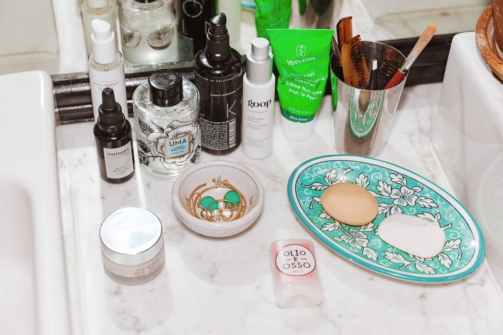 "I have a jet lag treatment that’s really soothing. First, I have to have Jo Malone Red Roses, it’s my favorite candle. If I get in late, I’ll immediately jump in the bath—the Rodin Bath Oil is so amazing and chic. Then I’ll put the La Mer Perfecting Treatment on my face. This shit is good! Afterwards, I have the Skinceuticals Triple Lipid Cream—it’s massively hydrating. A lot of the Skinceuticals line is too strong for me, but this just soothes jet-lagged skin so well. That’s the routine." —Karen Elson, model