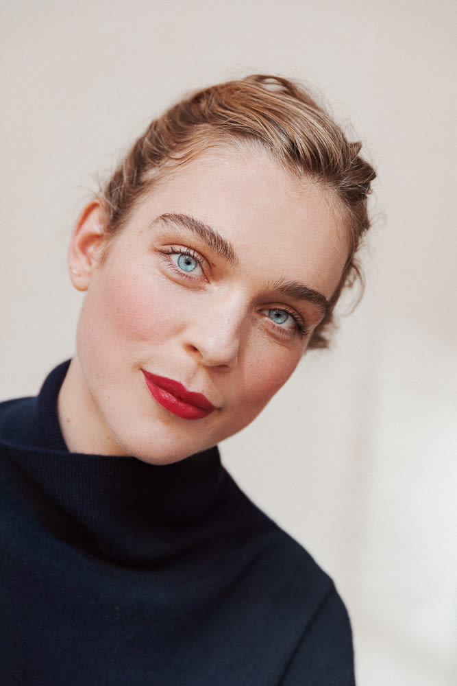 In my day-to-day life I like to be pretty natural. I’ll wear mascara. My dad’s girlfriend gave me the Clinique one that washes off with warm water. It’s perfect because cold water doesn’t do it—if you’re in the rain, it’ll stay. I wear a little bit of concealer if I have a spot somewhere. I have one from Chanel. It doesn’t become patchy or clunky. I like to wear red lipsticks—the ones I have are from MAC, I like their color and that they’re really matte. I don’t use anything in my brows except a clear mascara from The Body Shop.