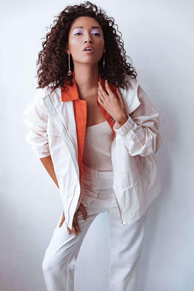 Aqua wears Raquel Alegra pants, Creatures of Comfort top, orange Rachel Comey jacket, Nomia jacket, Keds sneakers and Lizzie Fortunato earrings.