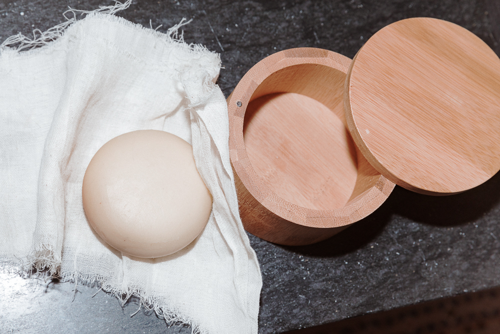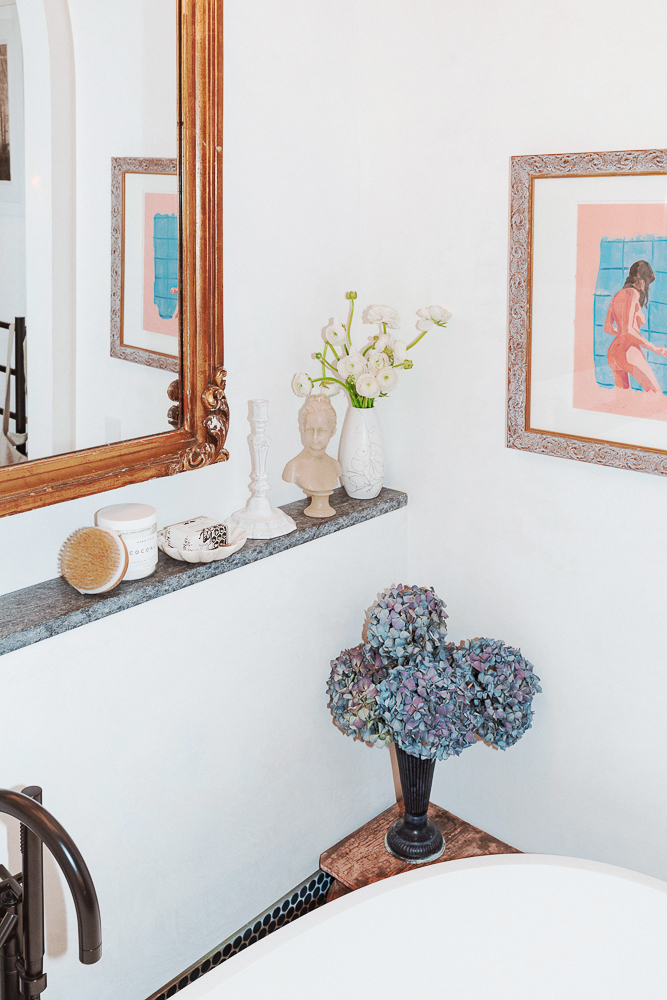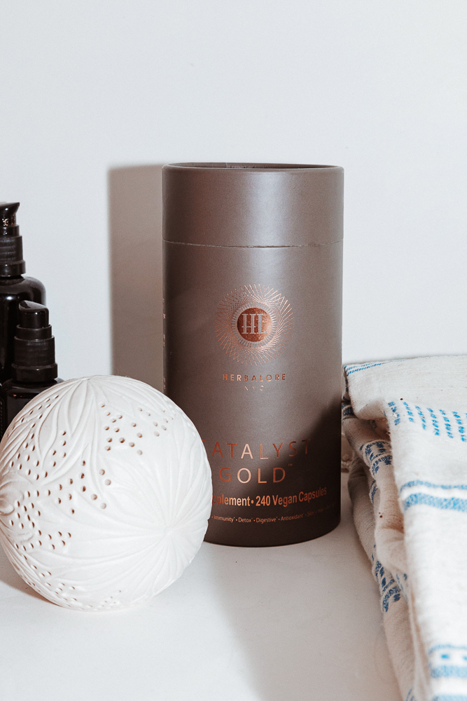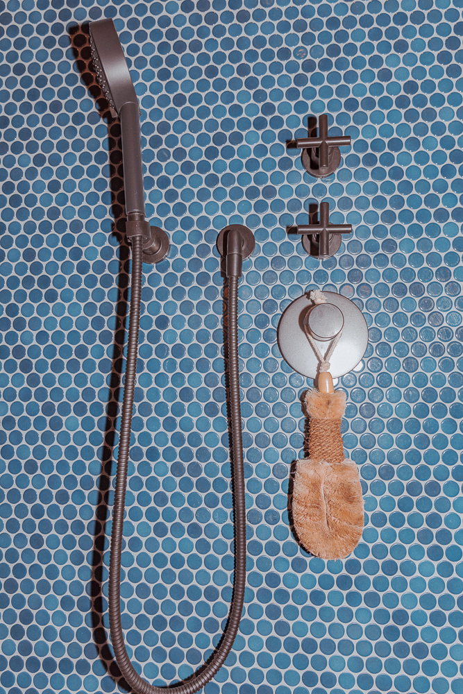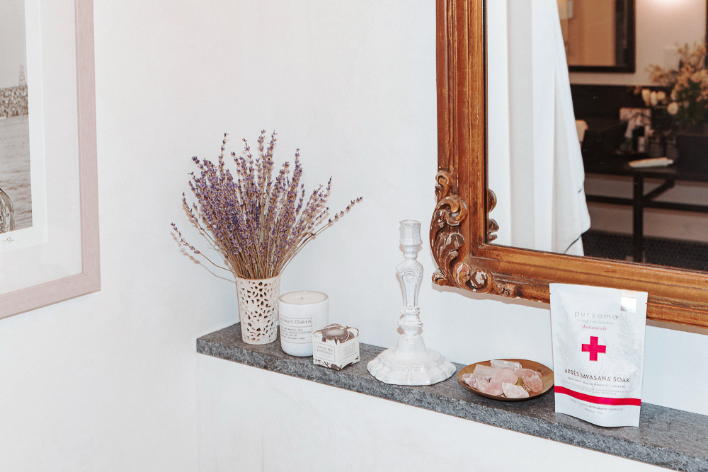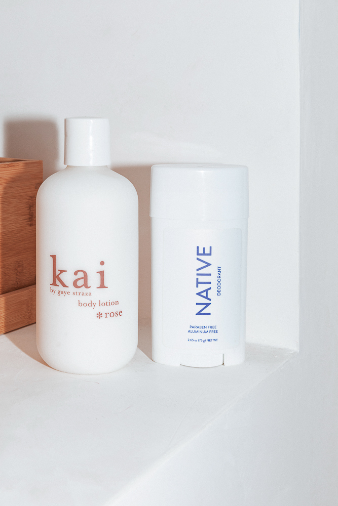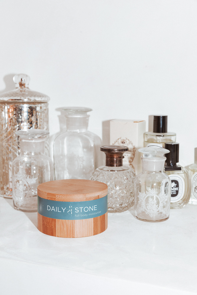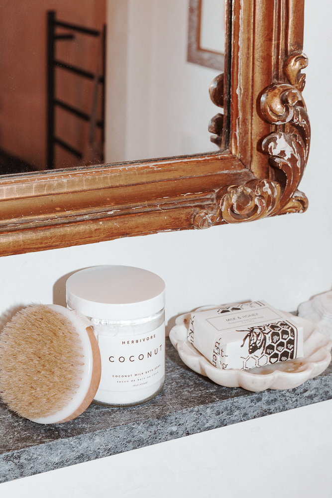 Oh, and this is a new thing. It looks like soap—it’s called the Daily Stone. You know how dry you can get in winter, and coming in and out of the heating and stuff? You just wipe this all over—I use it on my kids, because they get itchy, dry skin, and they love it, too. It’s a lotion bar, and it melts on contact. It’s got Neroli, sandalwood, rose—all my favorites. I like a good, strong, rich moisturizer. I also like to scrub. Onda makes this coffee scrub at an organic sustainable farm, and it’s meant to be good for cellulite and circulation. I also like dry brushing! And this stuff, Herbivore Coconut Milk Bath Soak, is really good for soaking. I try to take a bath every night—I’m a bath person. That’s the English in me.”