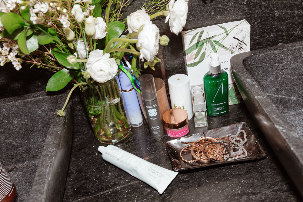 Then I do my routine. I use a mist, a serum or two, and oils. I really like this mist by True Botanicals. Sometimes I’ll use this Beauty Chef Probiotic Skin Refiner as a toner instead. It kind of smells like vinegar. I either just splash it on, or you can use a cotton ball. My favorite all-time product right now is Vintner’s Daughter Active Botanical Serum, and then I mix it with a strong moisturizer and just pat it on. It makes me feel glow-y, it’s my most constant product right now. I also like the True Botanicals Renew Oil, and I’ll mix it with their Vitamin C Booster. I love the Joanna Vargas Daily Serum—the smell! So good. For exfoliating, I use Joanna’s Exfoliating Mask or the Instant Facial from Goop. It’s strong! It really does work as a zing-pick-me-up sort of thing. The Honey Mud from May Lindstrom is so good, too—more soothing.