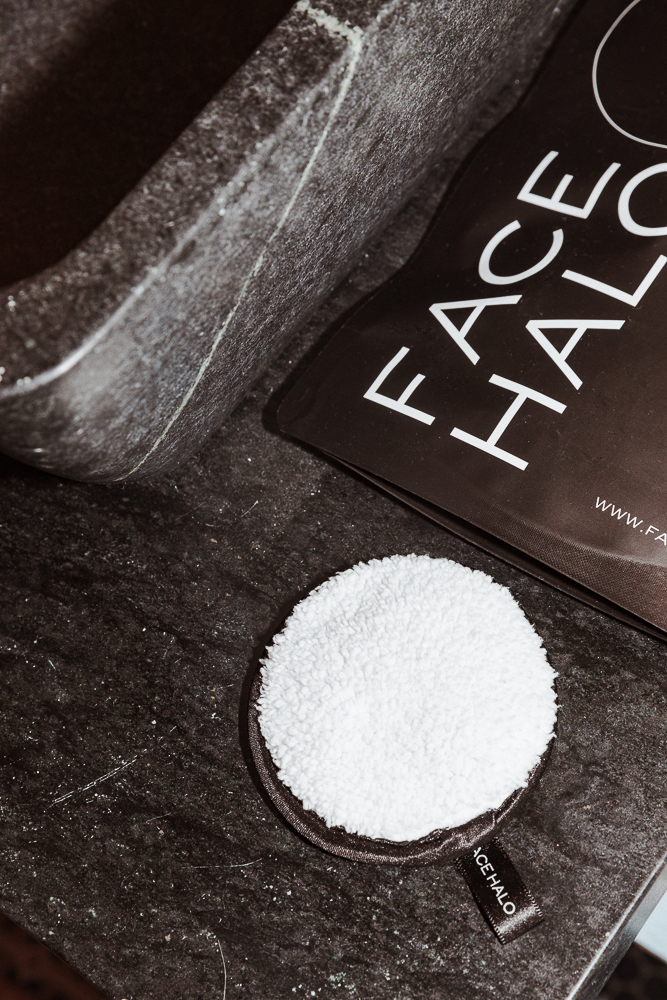 When I clean my face, I use these fantastic things called Face Halo—they look like makeup sponges, but they’re actually to remove makeup. All you need is water, but sometimes I add a bit of cleanser, especially if I’ve got heavy eye makeup or something. My friend actually owns the company, and she does this orange peel test—if you put foundation all over an orange peel and wipe it off with a regular cloth, the foundation stays in the pores of the orange. But if you use these microfiber things that they’ve invented, it wipes off every last bit of it, even in the crevices. I love this cleanser by Angela Caglia called Power Cleansing Balm with it. I also love the Baobab Oxygenating Cleanser from African Botanics. I use that in the shower a lot, and it smells great.