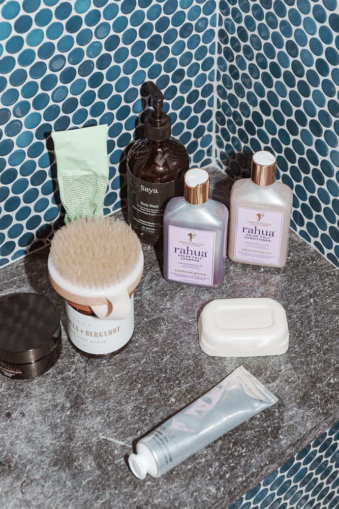 I’ve had a lot of long hair, but I feel like short hair suits me better. Chin length. I’m doing as much as I can for my hair because it’s thinning a lot. It breaks a lot and more easily, and I think it’s the abuse of hot irons, and hair dryers, and products. When you do a film, you’ve got that every day for eight weeks in a row. And color, as well. I am naturally blonde, but I’ve always brightened it. To fix that, I’m taking vitamins—I just started with Catalyst Gold ones and I am seeing some changes. I also use natural shampoos—again, changing them up. These Rahua ones smell great. I also am using Philip Kingsley stuff, which is a treatment for your scalp. When I went to their salon they said, ‘Back off the color,’ and I went about four months without it. It certainly did get better, but I had to deal with really ashy blonde and gray. Marie Robinson [does my color], but I recently went to Victoria at Whittemore House, and she was good! I don’t go that often because I can get away with it, so like every three, four months. I’m terrible with styling my hair—I literally just throw in some mousse, or throw it up in a ponytail. I don’t have dead straight hair, but it’s not consistent curls either, so you kind of have to do something. The Philip Kingsley Mousse is good for that.