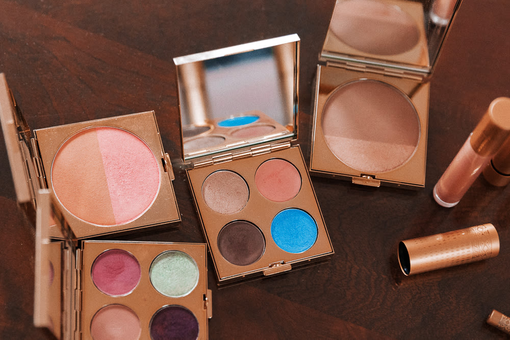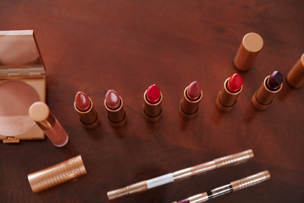 Right now I have on the gloss, Nefertiti. I’m also wearing both blushes, because nobody blushes just one color. If you go out for a run, you have rosy tones, peachier tones, and yellow undertones. I wanted a universal blush that would work for everybody, so Melon Pink is just a really lovely, bright pink with another side that is more melon, like a cantaloupe. They’re designed to use alone or to mix, and I like mixing them. And as far as actual foundation, I really just do it in spots where I need it. I also use Bobbi Brown Honey or Warm Honey.
