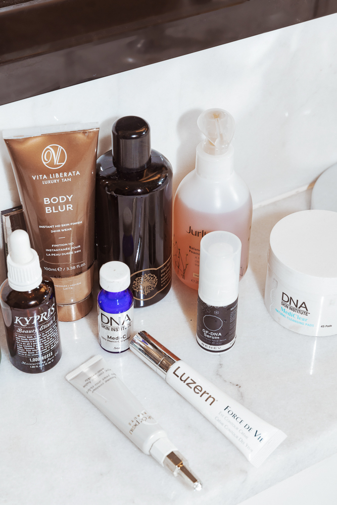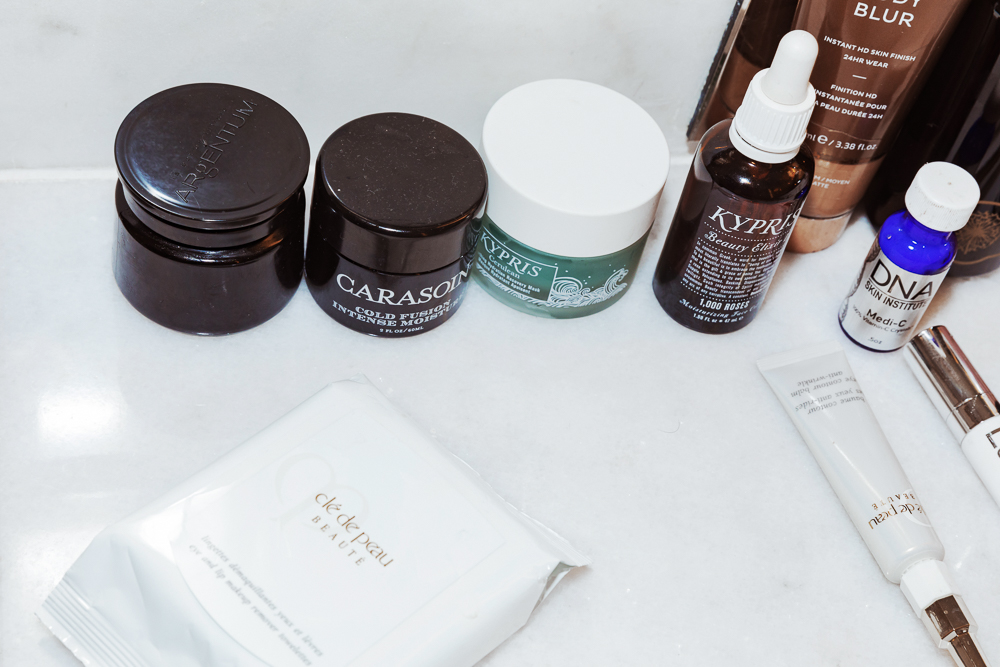 I love the Clé de Peau cream, which is a different vibe. It has a long shelf life. It’s the heaviest cream. I use the Carasoin Cold Fusion Cream, which is from my facialist. They make it themselves in Los Angeles. It’s a whipped kind of butter. I like to put heavy cream on when I go to sleep. I do tend to be dry, and I’m on a plane three to four times a week. I am so guilty of falling asleep with my makeup on, so I’ll wake up at three in the morning and try to really make it count when I have two hours without makeup. If I do fall asleep with my makeup on and I had heavy set makeup but I have the next day free, I’ll wear a mask all day. My kids are like, ‘Oh gosh, she’s wearing a mask again!’ I’m obsessed with the Kypris Cerulean Mask right now. It’s kind of a viscous texture, but I mix DNA Vitamin C Crystals into it and create a paste. The vitamin C crystals are really good for brightening. That’s a clear mask, so you can leave it on, go out, go about your day with a mask on. Nobody can even tell but I feel the need to tell them. Osea has a white algae mask that’s wonderful, and I also mix the vitamin C crystals in with that as well. I love a sheet mask before makeup—usually the Clé de Peau and SK-II ones. I keep the little wand for my eye cream in the refrigerator—I like keeping things in the fridge. I put two soda cans on my eyes before I get my makeup done. It’s great for de-puffing. I use a Clé de Peau eye cream, or Luzern Force de Vie Eye Cream. I never saw any real difference between my moisturizer and my eye cream, and then Clé de Peau came out with one that’s so thick and luxurious and doesn’t have a fragrance or any of the things I usually don’t like about department store products, and I really love that one.