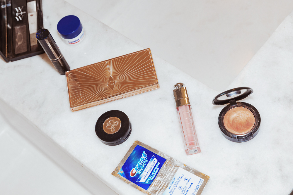 I am obsessed with all things Clé de Peau, and I have been from the minute I tried it. I’ve worn 030 foundation for as long as I can remember, and the Clé de Peau Ocher concealer is my favorite. I’ve tried everything else, but that’s the only thing where I feel like I’m looking at my own skin. When I’m doing my own makeup, I just take a MAC cream base and do it over, and maybe the Chanel Spices Palette. I use Chanel eyeliner usually, curl my lashes with a Shu Uemura curler, and then just mascara. Glossier Lash Slick is my favorite. I do an Anastasia pencil to fill in any gaps and then finish with Boy Brow. I love it. Lastly, I do the Haloscope highlighter just on the corner of my eyes and cheekbones. Then I use Charlotte Tilbury Filmstarbronzer. Day-to-day I wear Dior Lip Maximizer. The other day I was wearing this green Vampire’s Wife dress and needed a red lip, so I went for the Tom Ford blue-based red.