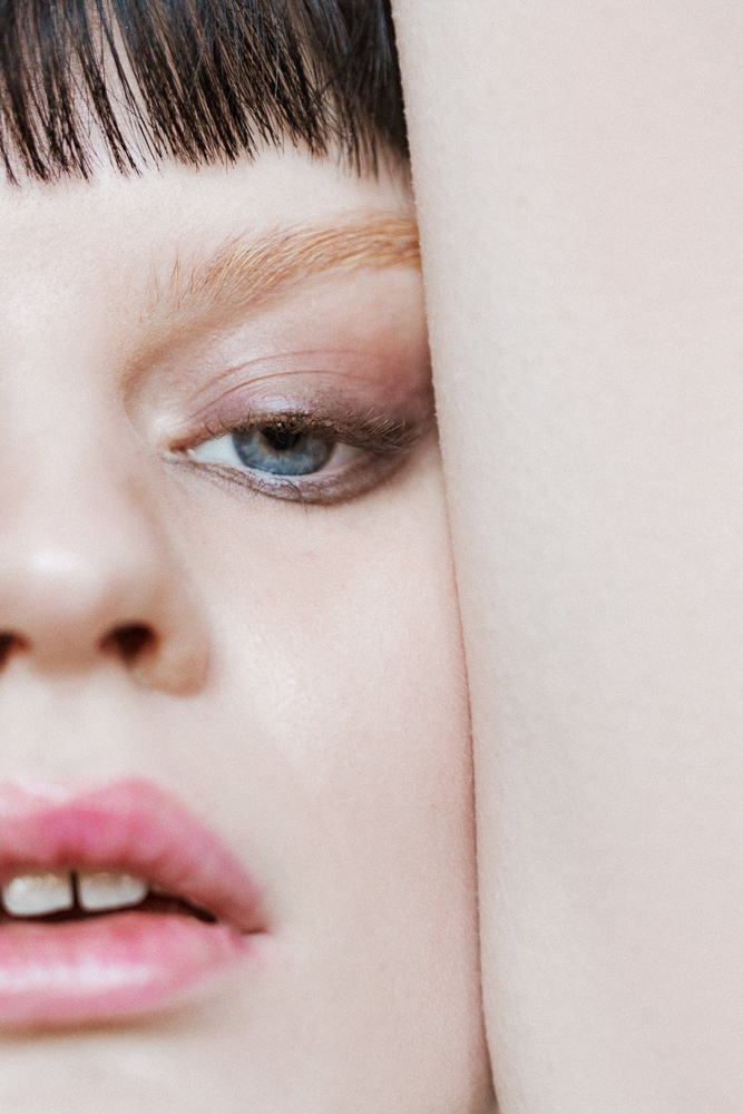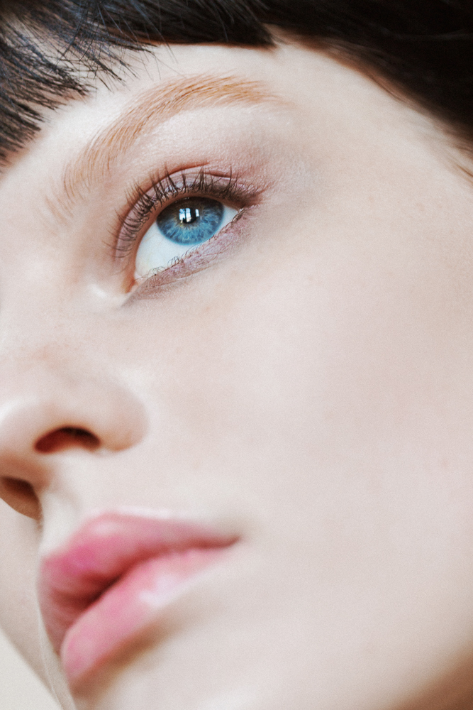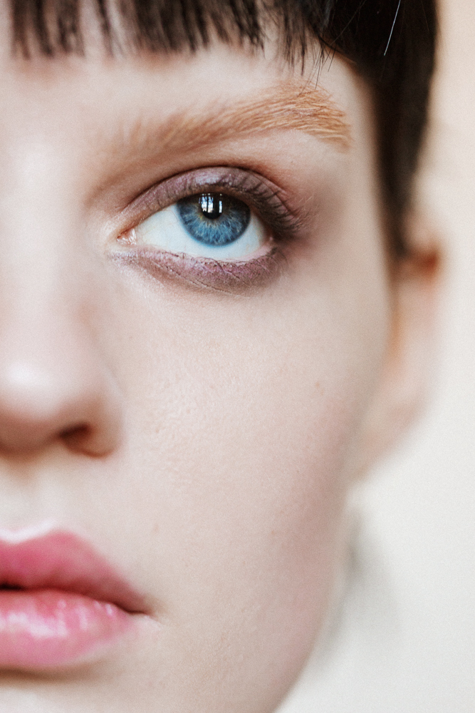On Hannah’s skin Wendy sculpted with the Burberry Contour Pen and Burberry Fresh Glow Nude Radiance “to pick up her skin slightly. It’s highlighting without highlighter.” She used Glossier Skin Tint as a base, but with a slightly darker foundation on the hollows of the cheeks for a natural looking contour. Then, for more modernity, Wendy mixed Glossier Cloud paint in Haze with a bit of Vaseline and “rubbed it down the cheek, all the way to the jawline “rather than on the apple and up, to give a more worn-in flush." She finished with Burberry First Kiss in Sweet Plum on Hannah's lips. No mascara. “I bleached her brows as well because the dark next to the white is striking, and it helps so the eye doesn’t look too gothic. It’s a bit more modern, fresher.”