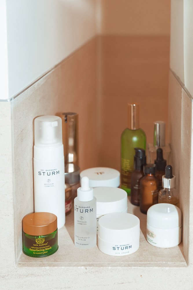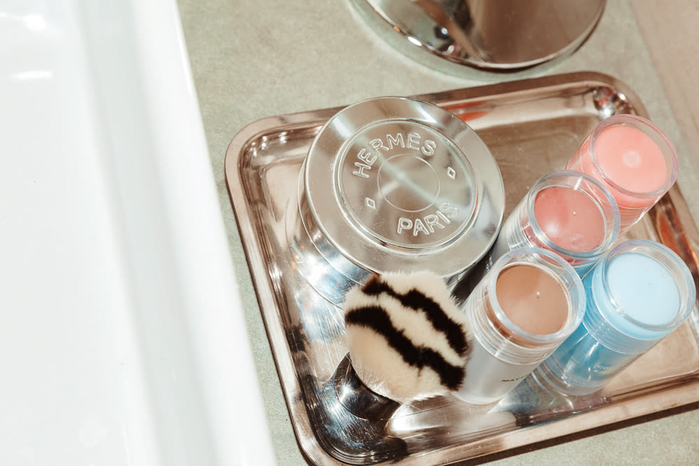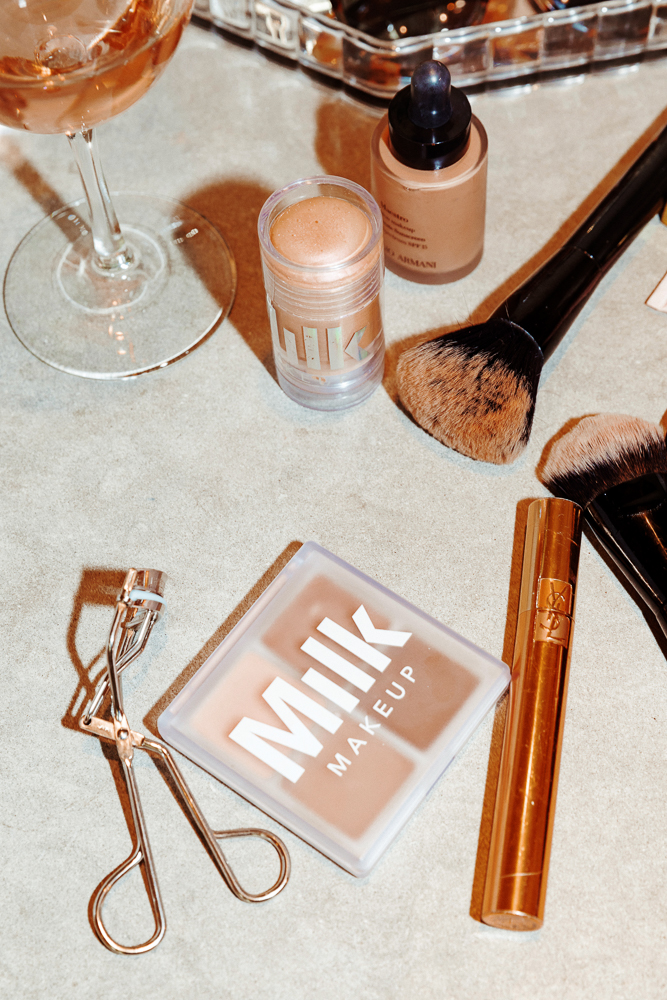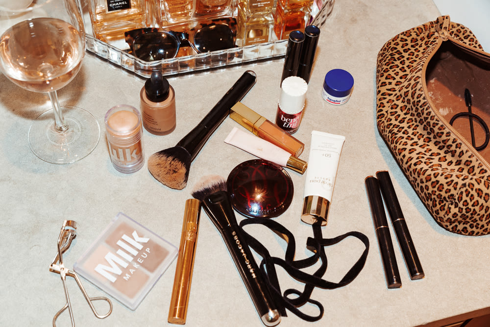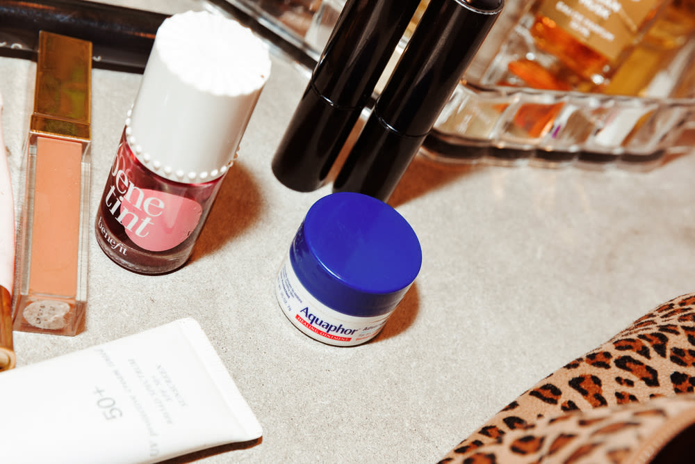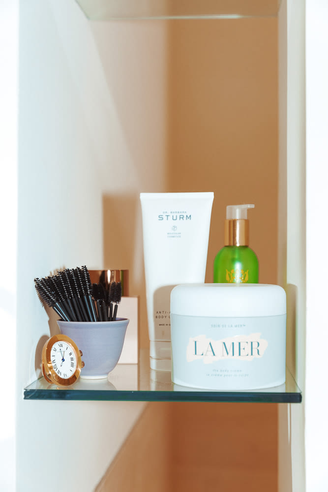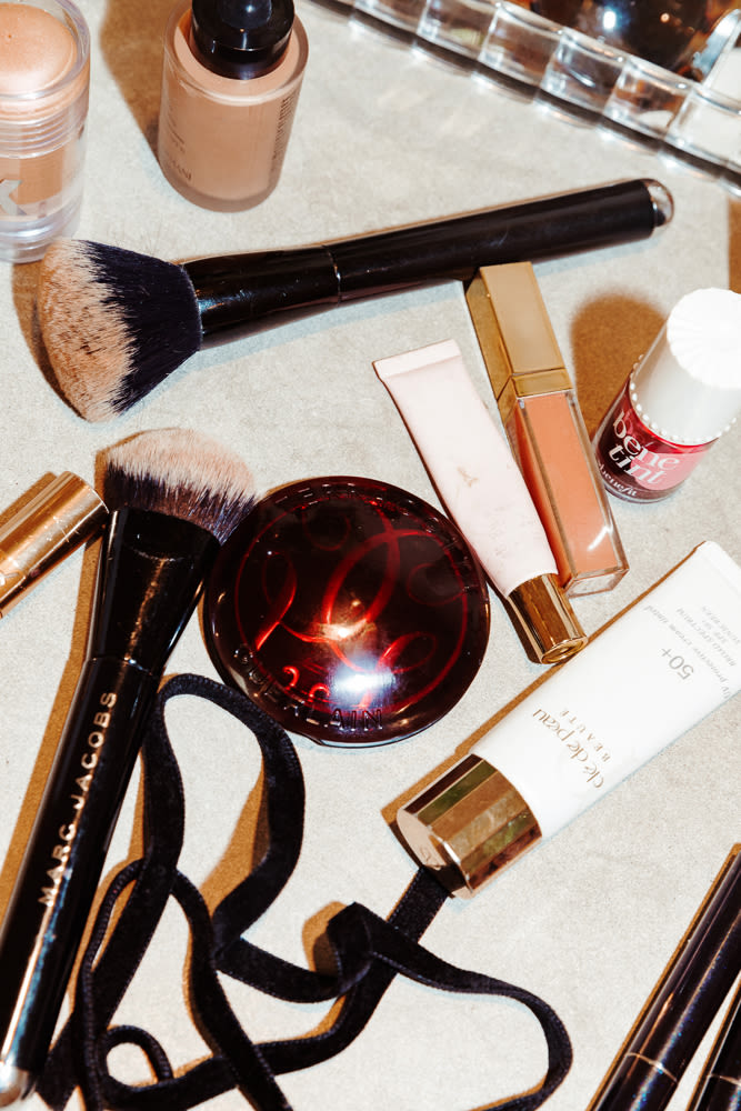 My kids get up at 7:00, and I usually don’t go out to dinner until 8. I think you can do both as a parent—it’s important to still get out there. I mean, yes, I am more tired at the end of the day—but it's good, especially in these nascent stages of our brand, to be out there and staying in touch with people. Also, I like it—I love the city, I love new restaurants and all of the creative energy that comes at night. If I’ve had a long day and I have to go to a party, I will come home first because I don’t have to dress really fancy at La Ligne every day. I go into my bathroom, put on music, and I pour myself a dressing drink. It’s just a glass of wine, nothing too strong. Then I clean my face, even if I didn’t wear makeup to work that day, and start with skincare. Sometimes I use this Watermelon Serum Stick—you rub it all over your face, and it leaves you a little rosy and moist. For night, I’ll typically wear foundation to even out my skin—I like the Armani Maestro with SPF. I use the Clé de Peau concealers under my eyes to get rid of any bags—that’s a big thing. I don’t feel like there’s one color that really works, so I’ll make a little palette of them. I feel like it’s really masking—I know some people find them too thick, but I like the matte-ness of it all. I use the Clé de Peau concealer on my scar, too. I had thyroid cancer, and it’s all out of my body now after two surgeries, but I always have to cover my scar so it doesn’t get dark. I’m religious about that, day and night, and this has SPF 25. I am very blue-black under the eye, so I don’t ever put mascara on my lower lashes, even though mascara is one of my big beauty things. I feel like it draws attention to darkness under my eyes. On my cheeks I just use the Benetint because it goes on really light, and I do like three strokes and rub it in. Then, I always do my bronzing, and I’m still old-school with the Guerlain Terracotta Bronzer all over, and on the neck. Then eyes—I rarely do anything on the lip. Just Aquaphor.