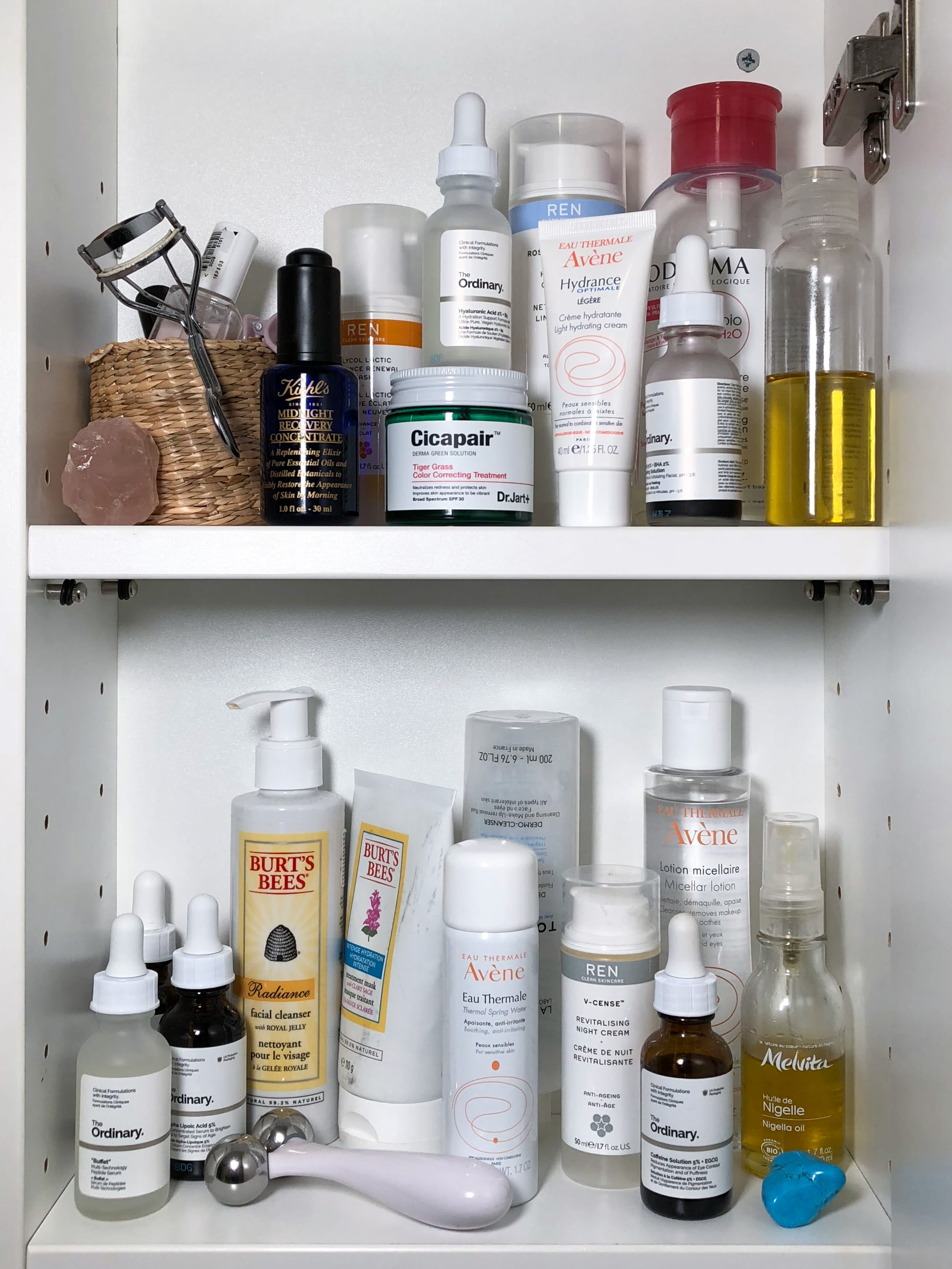 I like power packed serums like Granactive Retinoid 5% in Squalane and Alpha Lipoic Acid. Both from The Ordinary. But I can't use them every day. Three to four times a week seems to do the glowy trick for me. Avene Hydrance Optimale—the light one—is my staple. I use serums from The Ordinary—Buffet and their Hyaluronic Acid. Rain or shine. Night and day. Before I go to bed I combine with Kiehl's Midnight Recovery Concentrate which is up there as one of my favorite products of all time. It's the smell again. So rich and herbal. Recently I got a face roller as a gift from my boyfriend and I started using it at night with my oil or in the morning if I'm puffy. I keep it in my fridge next to Tabasco and I only take it out right before a rolling session.