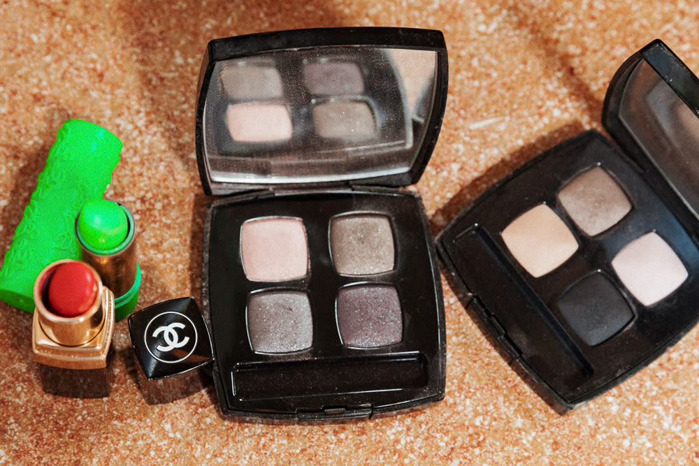 Josie Maran’s products are argan oil-based, and I like her highlighter stick. I’ll do that around my eyes and on my cheekbones, or I’ll use this Wander Beauty On The Glow stick. This is my favorite thing—it’s like a Moroccan color-changing something, and it kind of just makes the perfect shade of blush. I like blush high up, I don’t know why. A makeup artist once taught me a little trick—he said if you take the color from your cheek and put it on your eyelid, it brightens everything up. And Pat McGrath taught me that pinching the cheeks brings blood and color [to them]. For bronzer, the Dr. Hauschka Translucent Bronzing Tint is great in the summer, and I put it on with a little brush. And then it’s always great to have a red lip—I like my Chanel products. This is Rouge Coco in Arthur. If I’m going to do a little bit of a smoky eye or whatever, I like the Chanel quads. I can pull it off. I kind of go into the crease, and I’ll do more on the lid and blend it out with a brush. And I love Too Faced Better Than Sex Mascara. One last thing I have to tell you is that one time I was visiting New York, and I forgot all my makeup. I was going out, and I was like, ‘What can I do?’ I was at the Bowery Hotel, and I lit a match, and I got a little charcoal from the match and I did my eyeliner. And it worked! So, that was my solution.
