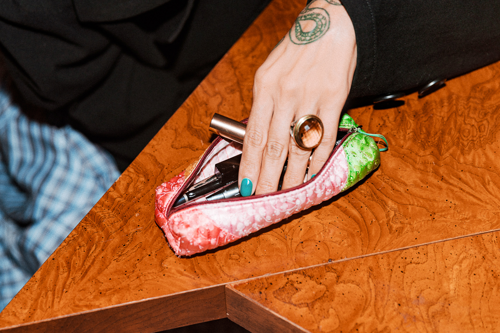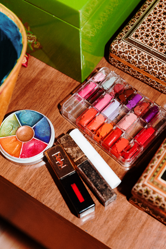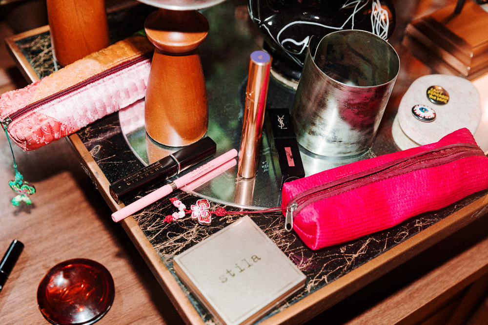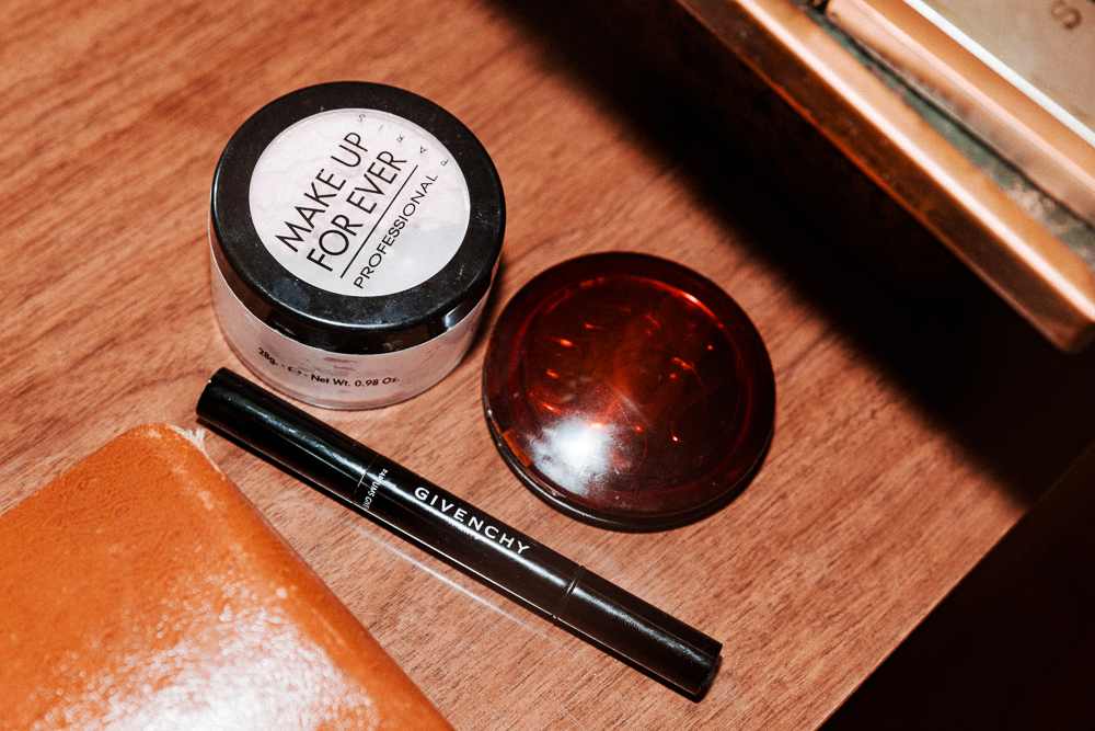 Eyeliner’s like putting on glasses for me—whenever I do makeup, it’s just part of the routine. The shape and the color varies, but it’s something that’s so a part of me. I use the Givenchy black liquid liner—I find that European liners have a super fine, almost calligraphy style, that makes it easy to flick out and do a very clean line. I also have that one in a blue that’s called Marine. It’s such a beautiful sapphire—a little more pop and depth than a black. The classic Diorshow mascara is my ultimate favorite because even when it starts to get old, it never dries out. And it always smells like roses—I think only Dior and YSL do that. I like to dust on a little bit of rose powder, which is really pretty when you have green skin like I do. It just gives it life. I love Guerlain powder, it’s my favorite. I love the Meteorites—I feel like when you have different spheres of color and you blend them, it’s just a kaleidoscope of bouncing color on your face that’s really pretty and angelic.