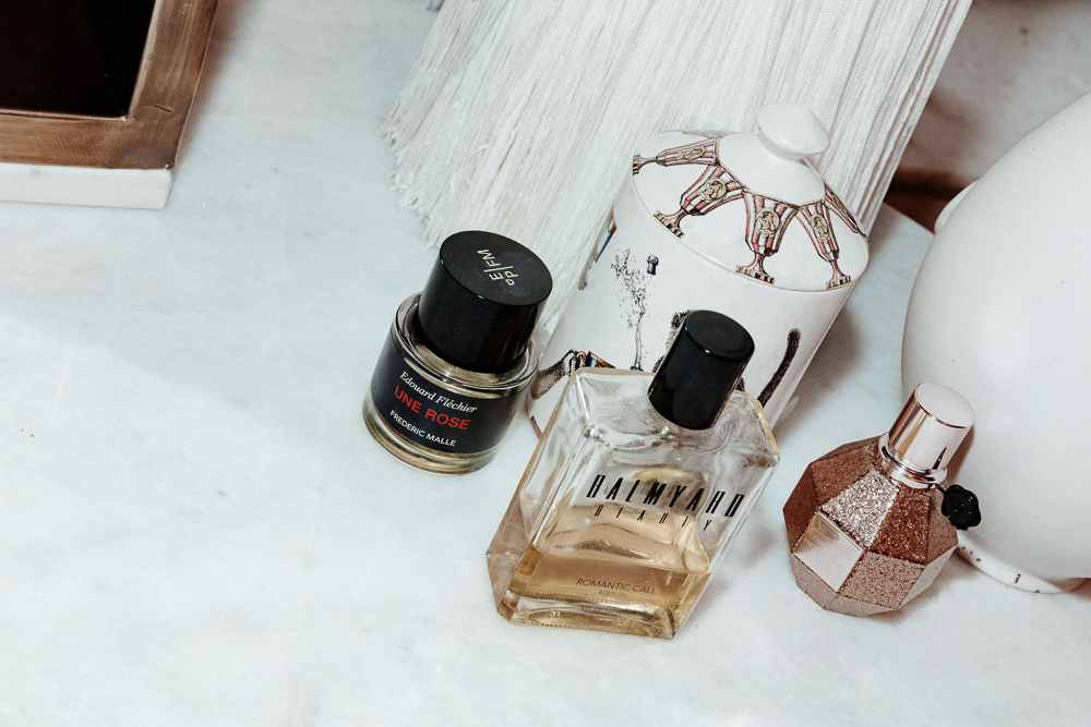 For body, I like Balmyard—I like the bottle. I also love Agent Nateur Holi Oil. After I’m tired of my face oil and I don’t want to waste it, I just put it all over my body. There are two things I don’t get for free in this world. One is Biologique. Number two is Frédéric Malle. The one I use is Un Rose—I’m not really a rose person, but there’s something really special about the scent. Viktor and Rolf’s Flowerbomb just came in the mail, and I really like that as well. And then I have so many candles—the Nars one, and the new Tom Ford one.