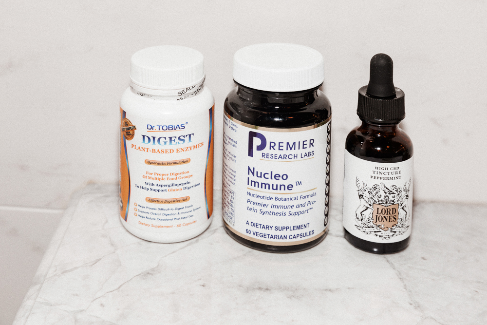 This stuff, Nucleo Immune, is amazing. I take it every day. There’s olive leaf and chlorella in it. I can’t break down pills, so I have to take a capsule. And I always take a digestive enzyme because I don’t want any funky stuff in my stomach. This is my new jam, though—Puressentiels. I spray it in the air. It makes me feel like I’m killing the cooties. It’s totally Vicks-y—some people are like, ‘Ugh’ when they smell it, but I like it. And then at night I spray Ren’s Now To Sleep on my pillow. It smells so good.”