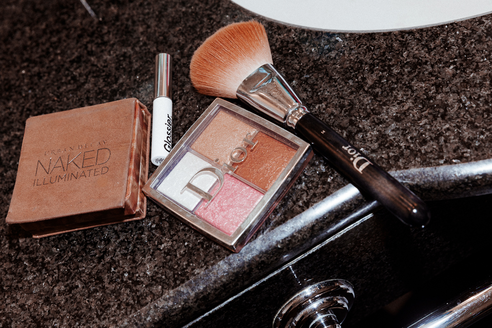 Makeup-wise, I’ve never been a person who does a lot. But I have so much stuff in my bathroom. I look like a bitch who can really beat her face, but I can’t. [Laughs] I love Dior Forever Skin Glow Foundation—I do it in two shades, 4N and 4*.5N*. I’m always in between two colors, especially as the seasons change. I love bronzer. I use this Urban Decay Naked Illuminated in Lit. And then I use the Dior Backstage Glow Face Palette. I use the lighter shade at the top, almost like a highlight. For concealer I use Nars, the radiant creamy one, in Ginger. And then I go for their Radiant Booster when I want a little glow. Everything gets blended with my Beautyblender. To set it all, I don’t use powder, just this Mario Badescu Facial Spray with Aloe, Herbs and Rosewater. I use Tatcha also, but what I really like is their primer. I love that—it feels so nice and soft on your skin.