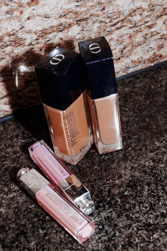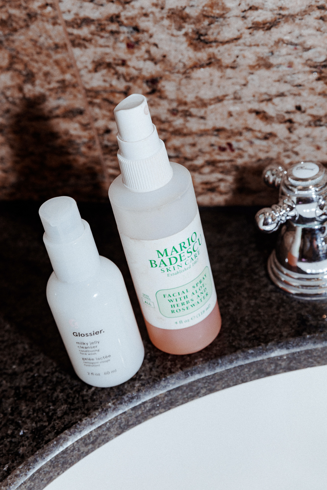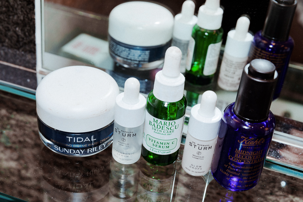 I’m definitely a skincare girl. I feel like once your skin is supple, you don’t have to put on too much makeup. In the mornings, I start off with Glossier’s Milky Jelly, just to get really clean. There are two acids I use next, either Dr. Dennis Gross Universal Daily Peel or Sunday Riley’s Good Genes. I like Sunday Riley’s Tidal Enzyme Cream, too—it’s so good, I’m actually obsessed. Mario Badescu’s Vitamin C Serum is also in the rotation. Then I apply my serum—the Dior Prestige La Micro Huile De Rose Serum. I also use the KNC Undereye Pads, which are good to use on the plane.