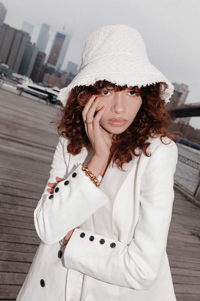 Jacket from Frame. Hat from COS. Jewelry from Laura Lombardi, Ursa Major, and Ginette.