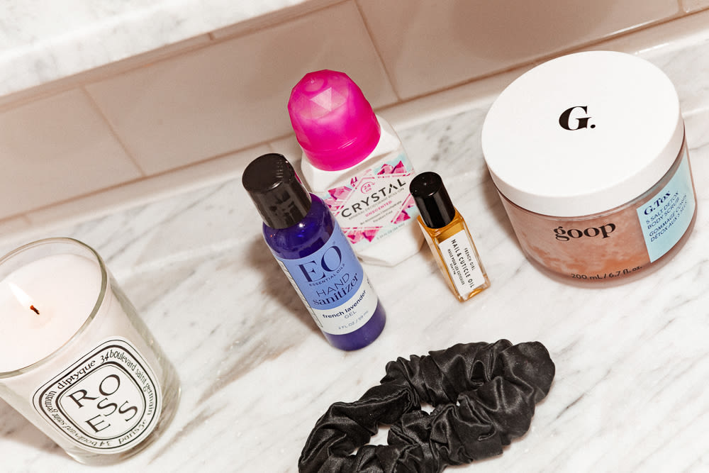 I try to take a bath every morning, and I love Goop’s bath salts. There’s one that’s mustardy, and it smells so good. I always have Jason body wash from Whole Foods, either the rose one or the lavender one, and I also use that on Dixie. If I'm going to a big event I’ll use normal deodorant, but right now I’m fully on the crystal stick. Manicures are my favorite indulgence—I go once a week, if I can. To me, having fresh nails is heavenly. This is my first delve into nail art, for my perfume launch—MoMo came to me to do it. I wanted some little roses and I asked her to do one on each ring finger, but she said they had to be sporadic. Teach me the way of the nail art, MoMo! Usually I just do a buff or OPI Passion, which is a really nice see-through nude. You can’t go wrong.”