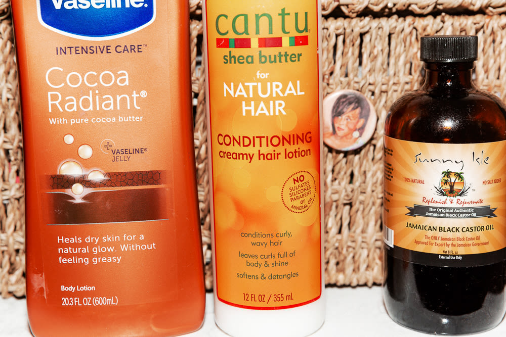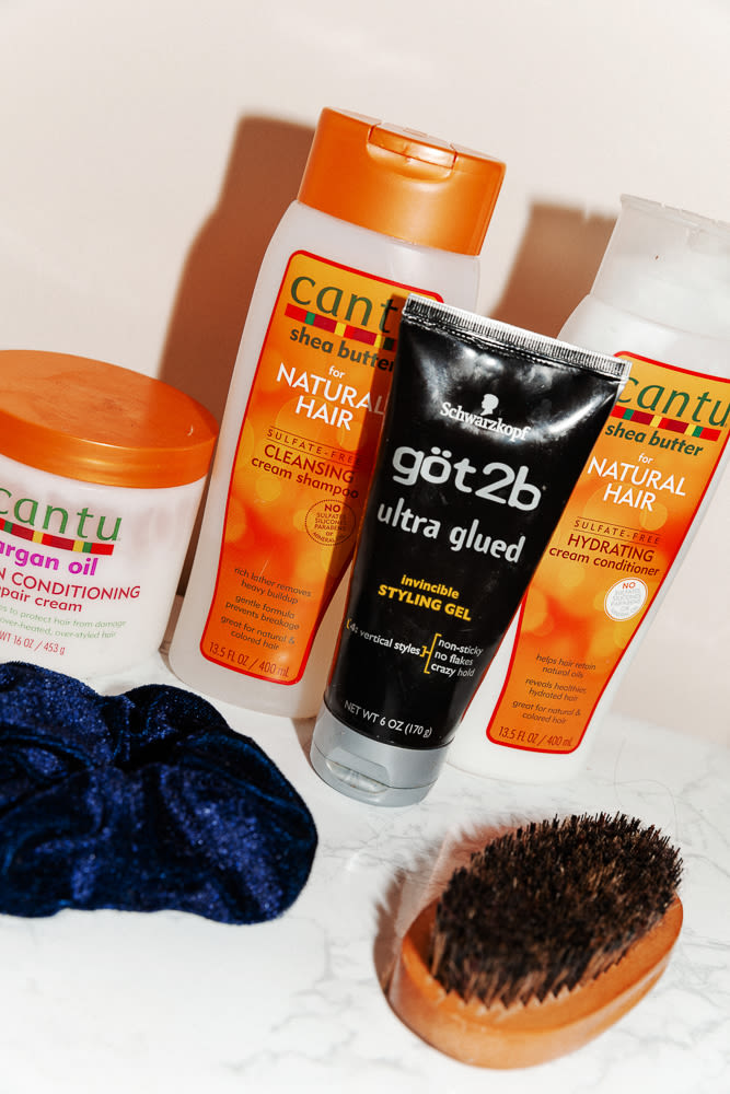 This is a protective hairstyle, so I can avoid using a ton of product. I wash my hair with Cantu shampoo and conditioner, and then use a Cantu leave-in conditioner. When I wear my hair out, I use castor oil just to give it some moisture. I’ll either wear it in two puffs, or slick it back with edge control and put on a phony pony. If I’m doing that I’ll blow it out straight, but in general I really try not to put too much heat on my hair. It will fall out. I’ll look great, and then I’ll be effectively bald.