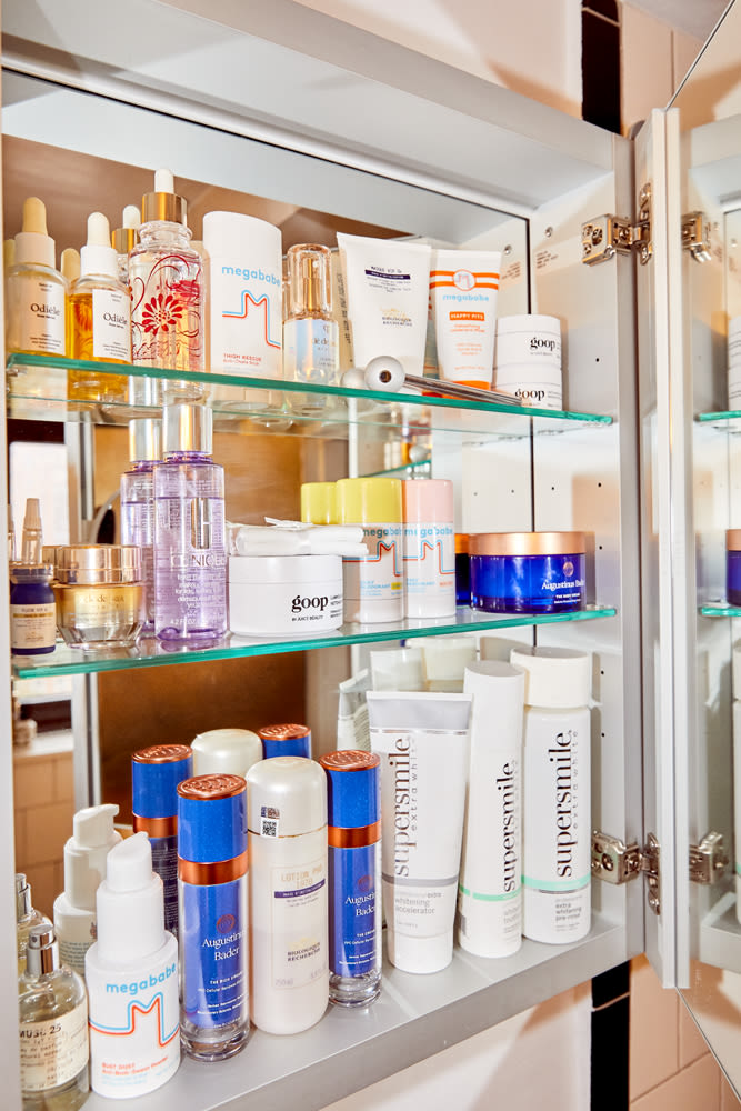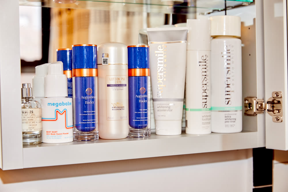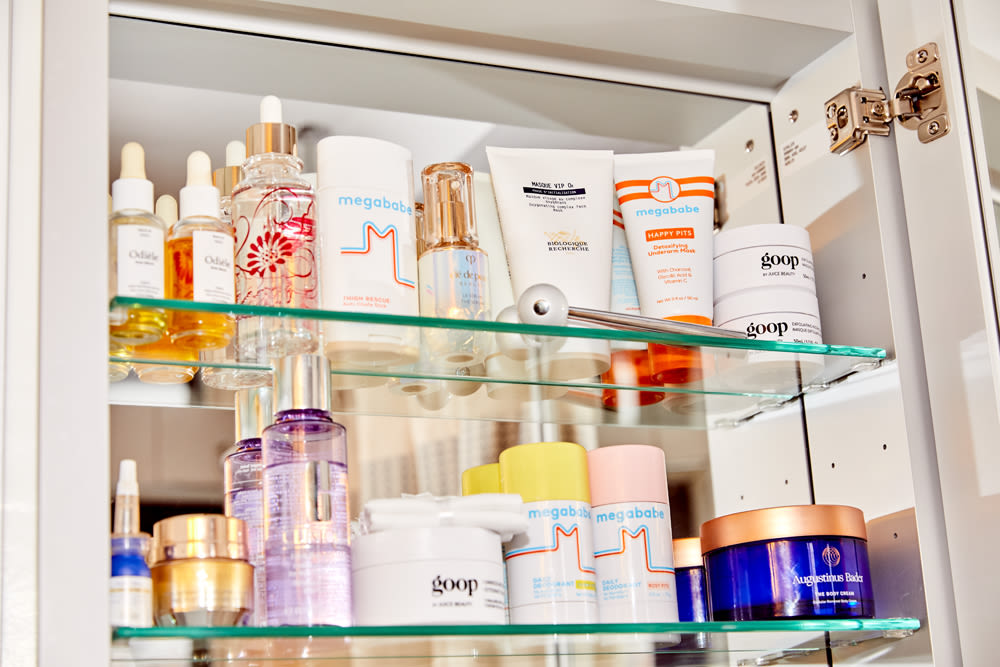 I have a tough time with perfume—things give me a headache. We made unscented Thigh Rescue because I use it so much that the [original] scent started to bother me. But I do love Le Labo Musk 25. In the shower, I love the EO Lavender body wash and I’ve also gotten into this pH Balancing Cleanser by Love Wellness, which is supposed to be good for women. Then I scrub with the Follain Sugar Body Scrub, which still feels hydrating. When I shower at the gym, I use my Megababe Shower Sheets. I also use the Deodorant Wipes when I’m working out and can’t shower after, or if I’m traveling. Rosy Pits was the third thing we launched, and that came from the fact that I wanted an aluminum-free deodorant without baking soda. Baking soda deodorants don’t work for me—a lot of popular natural deodorants on the market use it, and it breaks me out. I make things for me, because I want them. I’m not just pushing product. My armpits are hairless and have been for many years, and my bikini situation is pretty good, too. I’ve been doing laser hair removal for like seven years. The real holdout is my upper lip—I’m still figuring out my solution for that, because laser’s not working for me. I think I have to do electrolysis. But anyway, then I put The Body Cream everywhere. I’ve really bought into the whole Augustinus Bader thing."