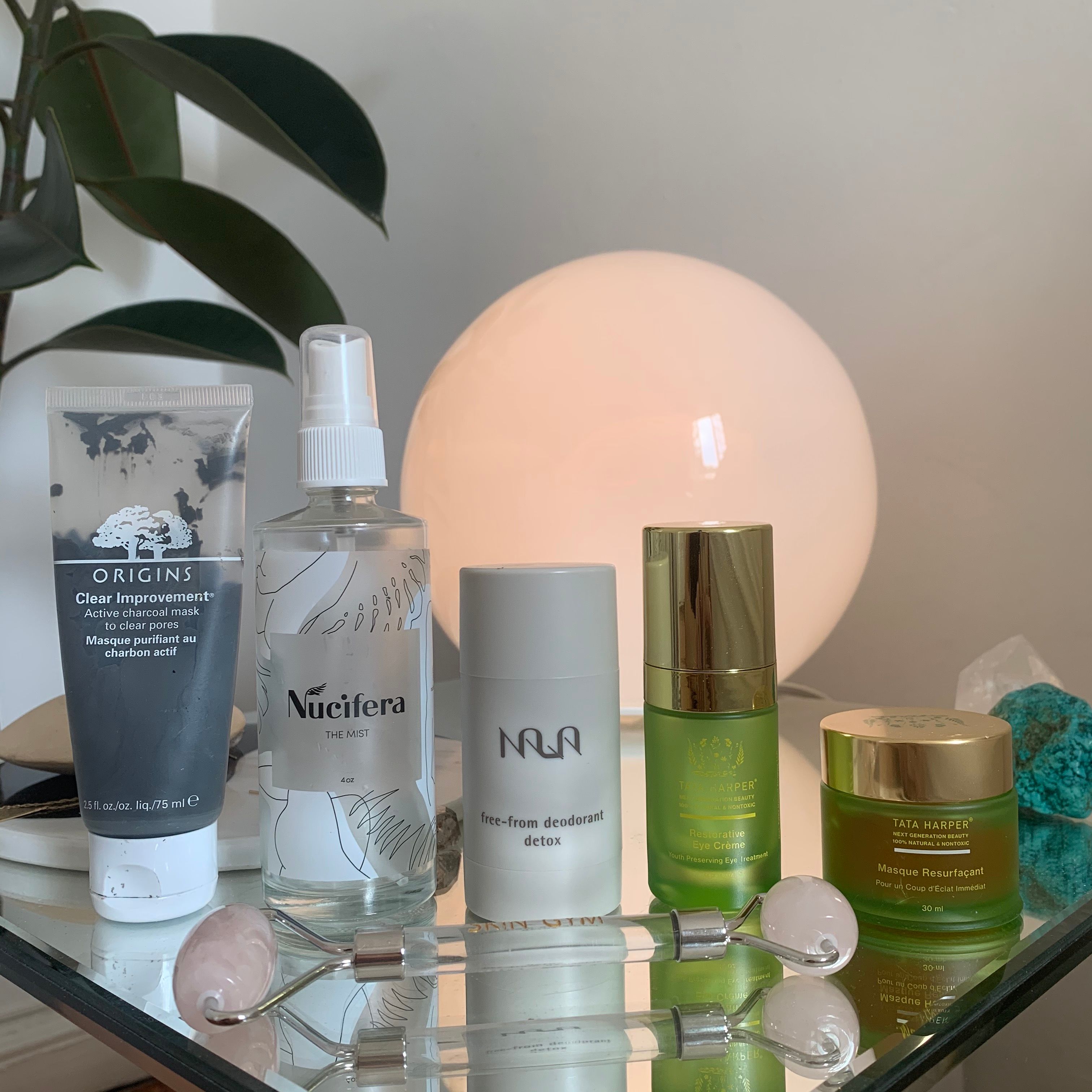 For my skin, I start with the coconut cleanser by Yucatan Senses, which is technically a body wash. I ran out of my usual facial cleanser and, in a pinch, started using this stuff on my face. For the first time since middle school, I’ve barely had a blemish in weeks. So even though it might be a skincare sin, I’m sticking with it! Then, instead of moisturizer, I use The Mist by Nucifera. I find it to be a great alternative to regular moisturizer for my sometimes-oily-sometimes-dry combination skin. It’s gentle and hydrating, balances excess oil, and has the perfect amount of spritz per spray (very important). My absolute favorite skincare product is Tata Harper’s Restorative Eye Crème. I use it around my eyes and on a line between my brows that came in pretty loud and proud at 29. It’s on the pricey side, but less expensive than Botox. Within two weeks of using it, the line between my brows was completely invisible and my eyes looked dewier and more supple than they had in my early twenties! And whereas most eye creams tend to irritate the eczema that likes to flare up around my eyes, this product actually soothes it. I then use my refrigerated Skin Gym facial roller for an added dose of cooling and calming. But when I’m due for a little extra pore cleaning, I turn to my trusty one-two mask combination. Origins Clear Improvement leaves me with a clean skin feeling and noticeably tightened pores, and then I use the Tata Harper Resurfacing Mask, which adds a noticeable glow and softness.