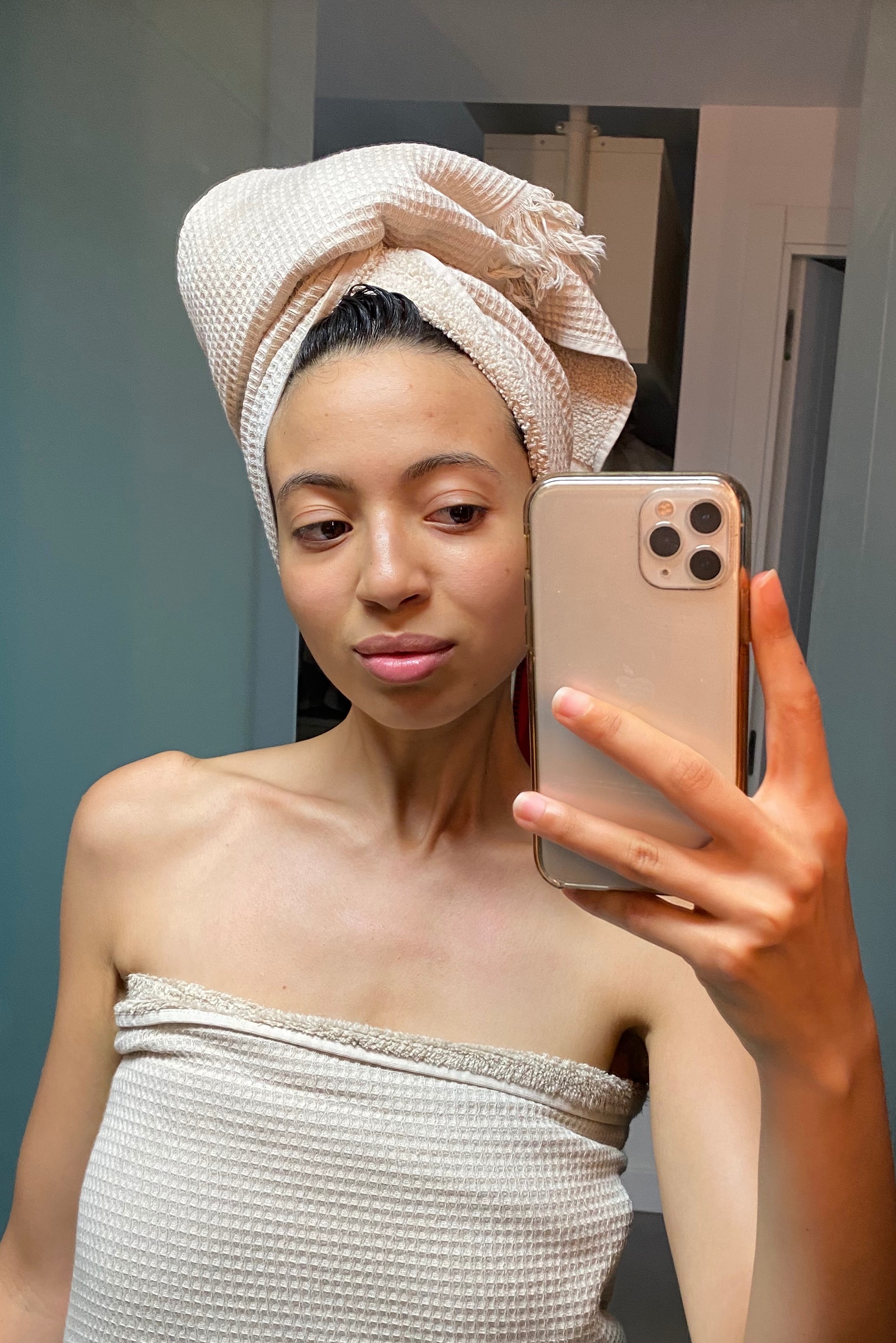 I cleanse my face with Open Sesame—I love a good cleansing oil, this one has a really gentle texture that feels very nourishing. I then spray some Mazhar Garden on, which smells like the orange blossom water my mom uses to cook baklava or briwats. I like to observe myself in the mirror (or the vision boards I keep in my bathroom) and set some intentions for the day while that product dries. Once I feel my skin is ready I start playing with serums—I am obsessed with using vitamin C and niacinamide in the mornings. While I was living in Amsterdam I fell in love with a few Nordic beauty brands. The Hydration Serum with Niacinamide from Verso and Supreme-C Serum from Nuori do a great job keeping my skin bright and glowy. Another vitamin C serum I’ve recently tried out and liked is CC Me from Summer Fridays. I think it works well and it is well priced for what it offers. Afterwards I apply Wonderful Lamp, an eye cream packed with black cumin seed oil. I like to finish my routine with Peri Banu, massaging my face with some techniques my mother taught me. I basically slap and pinch my face to firm up the muscles and activate blood circulation. It also helps me wake up and abstain from coffee! Your fingers can do so more than that pretty jade roller. Finally I apply La Roche-Posay Anthelios Ultra-Light Mineral Sunscreen SPF 50, and I’m ready to start my day.