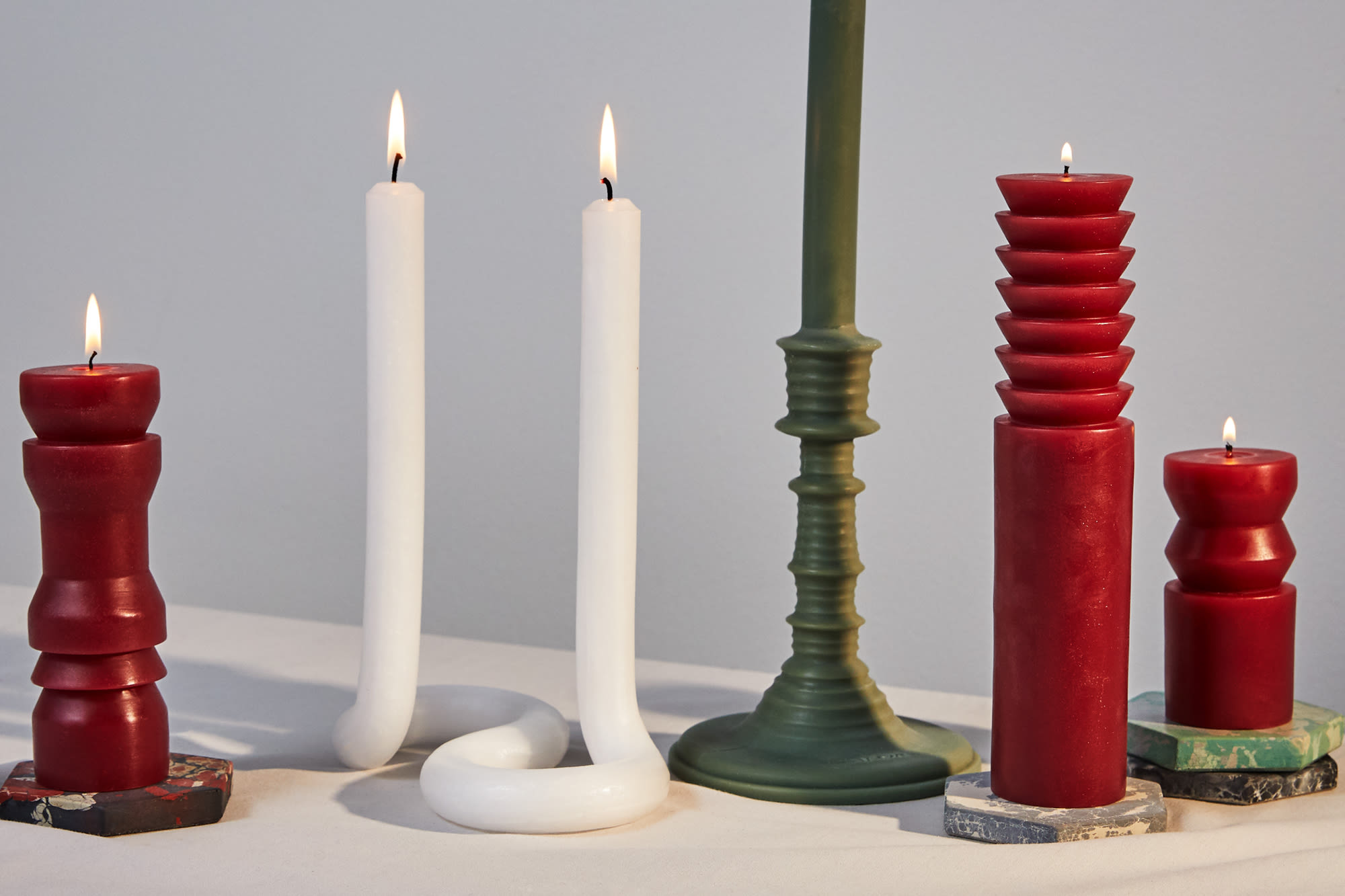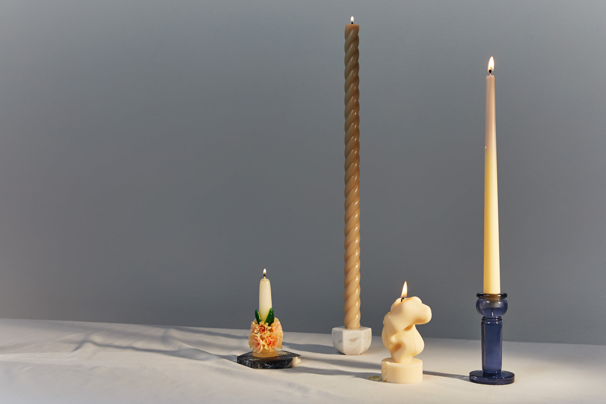 Shot with: Snowe Marble Candle Holders in White, the Aeyre Prima Candlestick and Concrete Cat Hex Coasters