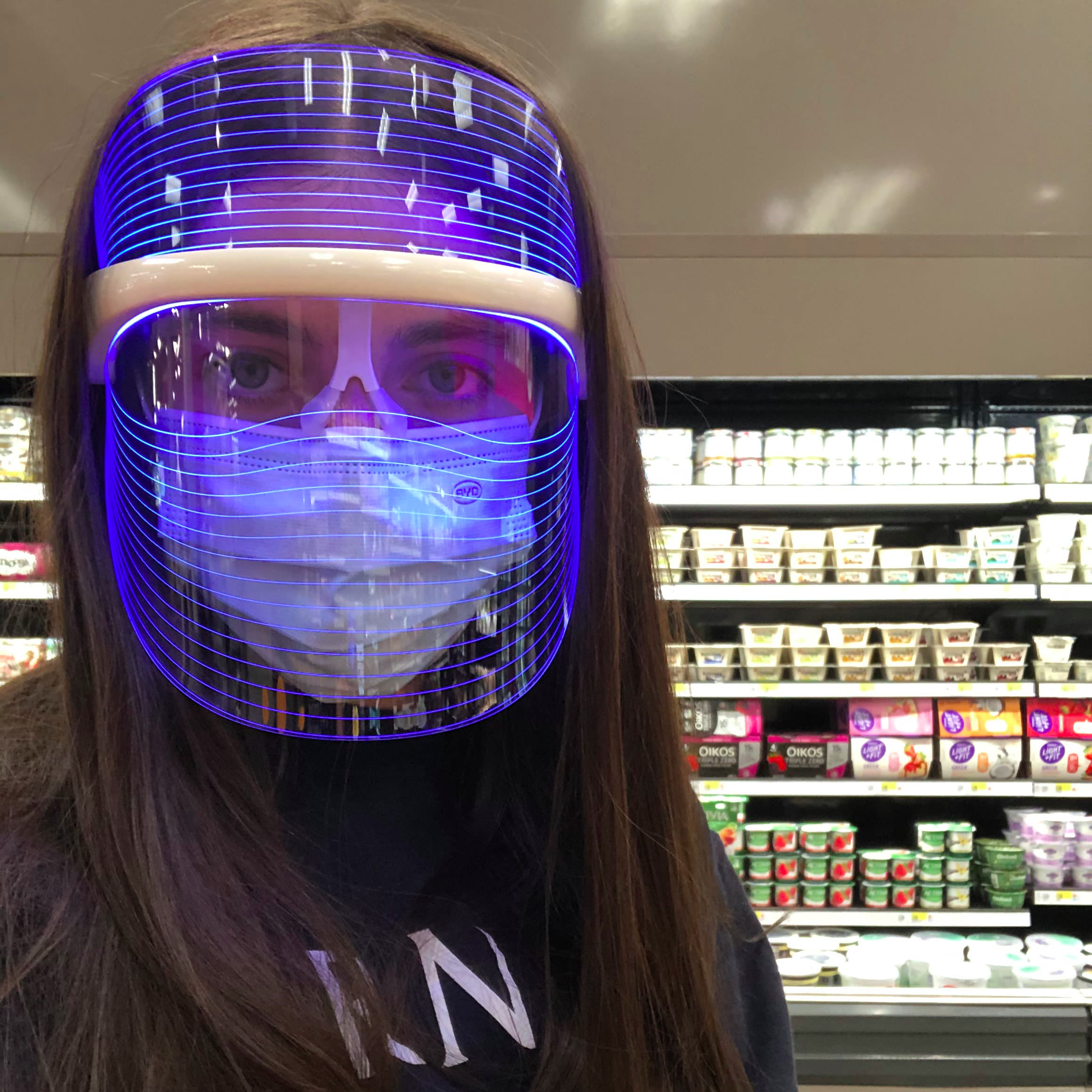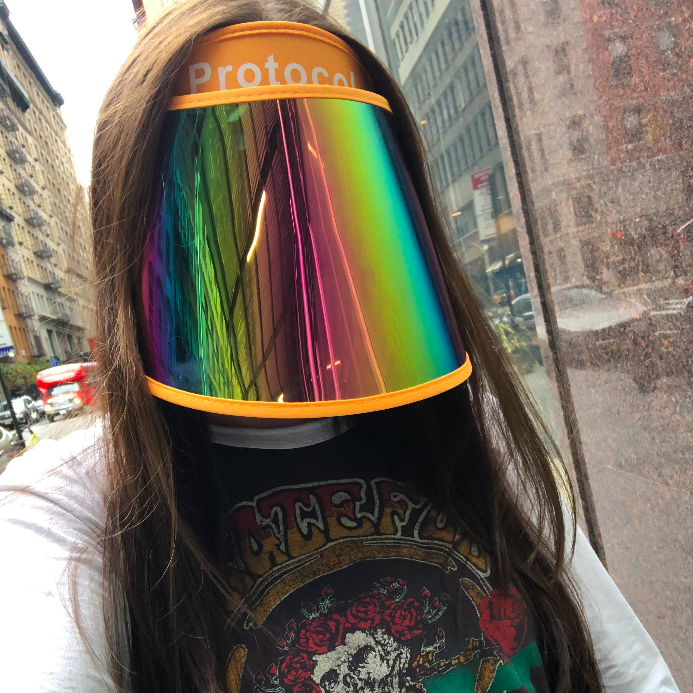 The final face shield is probably the most effective if you really want to up your skincare game while protecting your vulnerable mucous membranes. (Ew?) It’s a UV shield, a piece of plastic treated with a special reflective coating to block the sun’s harmful rays from reaching your skin. It’s a favorite anti-sun trik of Tiktok skincare sensation Vi Lai, who often posts videos in her metallic silver version. You can find lots of different UV shields available online, but my fun rainbow version that’s reminiscent of ski goggles is from Protocol (which will be available with their Complete Renewing Line). The top feels like a comfy, cushion-y headband, and the shield itself lifts and lowers on a hinge from the corners. It extends past my chin and fully wraps around the sides of my face.