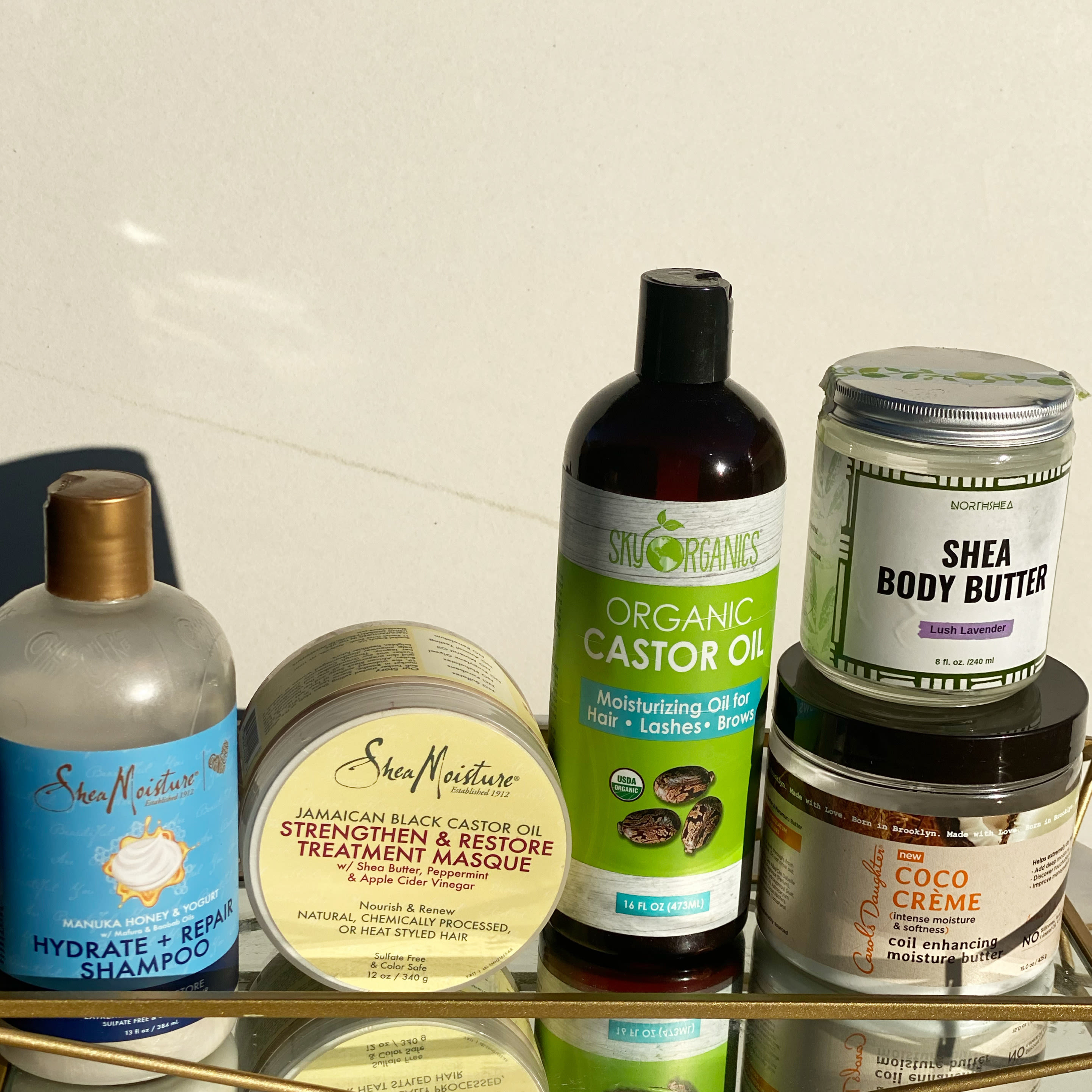 I wash my hair once or twice a month with black soap from Ghana. I put it in a bottle with some essential oils, some moisturizing oils like jojoba, castor, argan, sweet almond if I have, and then some stimulating oils like rosemary and maybe a little tea tree. Then I add hot water, and let that sit for two hours. After I shampoo I go straight into deep conditioning with Shea Moisture’s Manuka Honey Mask or the Black Castor Oil Mask. Those two are amazing, especially if your hair has been colored. Detangling takes like three hours. Then I sit under a hooded dryer for an hour, rinse it out, and style. I have low-porosity hair and heavy products don’t really penetrate, so I love to use a spray leave-in. I usually use the one from Shea Moisture’s Manuka Honey and Yogurt line, but if my hair feels dry I’ll use a heavier butter from Carol’s Daughter. I finish off with Northshea’s shea butter. This brand is amazing, and their shea butter is fair trade and really fresh.