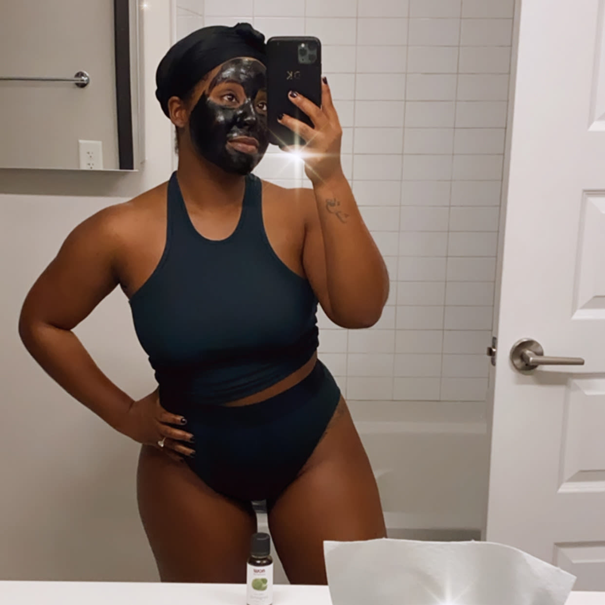 In the morning, I put on my robe, go to the kitchen, and turn on the kettle. While the water’s heating I do my skincare. I'm a huge fan of the Supergreat app—they sent me this powder face wash with reishi mushrooms from a teen brand called Recurrent, and it literally looks like seasoning salt. I wash with that first, and then I double cleanse with the iS Clinical Warming Honey Cleanser because honey is antibacterial and really good for acne and eczema. I get eczema in the weirdest places—it’s only my eyelids, knee caps, and butt. Next I apply our topical product, which is in the final stages of formulation. I cover any maskne with pimple patches—usually Starface or Evenprime. And then I go back into the kitchen to make my Mud Wtr. It’s basically mushroom coffee with a ton of adaptogens in it—it’s seriously the best thing that’s ever happened to me. I’ve been working with Black chefs to develop adaptogenic recipes for our site that are familiar in the Black kitchen—for example, instead of mushroom coffee, a chef made us an adaptogenic chicken rub. You still get the benefits, but it’s something you’re used to cooking and consuming, and maybe that’ll make you more open to other things later on. Recently, all of these people in the Black wellness space are going vegan and practicing yoga… I love that for us! But it doesn't mean you don't want your grandma's biscuits, or fried chicken on Sunday, or mimosas at brunch with your friends. Being relatable is really important to us, and a healthy lifestyle doesn’t have to be restrictive or inaccessible. I worked out this morning, but I also had tacos for lunch, you know? There's a balance.