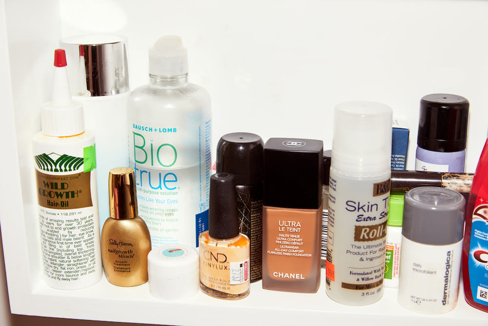 I don’t take a lot of the crazy medicines for my Crohn’s anymore, but I am trying really hard to take care of my hair, because you never know. Nutrafol is my shit. I got it for free and at first I didn’t believe it would work, but it’s legit—it’s thickening up the sides and crown of my head, which has some stress breakage. I grease my scalp actively with Wild Growth Hair Oil, which has been part of my scalp oiling routine since I was eight years old. The formula has changed unfortunately, but I still use it three or four times a week. I also do an apple cider vinegar rinse every Sunday. I make it from scratch—just water, and enough apple cider vinegar to get the dirt but not too much, because your hair will smell horrible. With faux locs, dry shampoo is clutch. I use the two from Ouai. Their Super Dry Shampoo spray is for when I want a refresh because I know a guy will be sniffing my hair and I want it to smell good. And the foam is if I rode my bike for 70 miles. To shampoo my hair, I mix some diluted Dr. Bronner’s Peppermint with a little witch hazel, lavender, and ylang ylang. I use the conditioner from Ouai, and then I condition my scalp with Grounded from Tonic, which is CBD oil. Hemp seed oil is full of vitamin E and fatty acids, and it’s also good for increasing blood circulation. That’s a great weapon against hair loss.