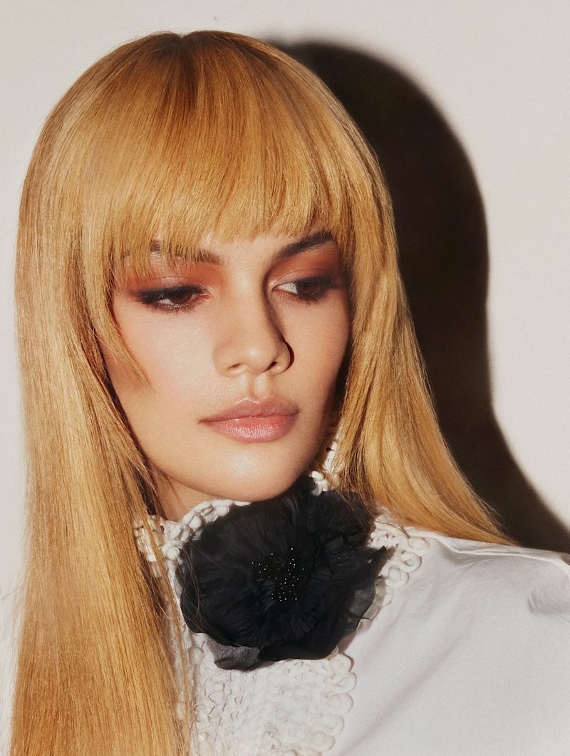 While the first look was committed to lips, for this one, Shayna put just a little bit of something everywhere. “Here I used the Neo Nude Balm again, just a bit heavier and one shade darker,” Shayna explained. She burnished 21, a deeper taupe, into Mavaro’s eyes, lips, and cheeks. Up top, she created a subtle powder smoke on Mavaro’s lower lash line and in her crease with Westman Atelier’s new Soleil Riche Butter Bronzer. And on her lips, she used a sheer coat of Charlotte Tilbury’s Iconic Nude lip liner punched up with clear gloss.