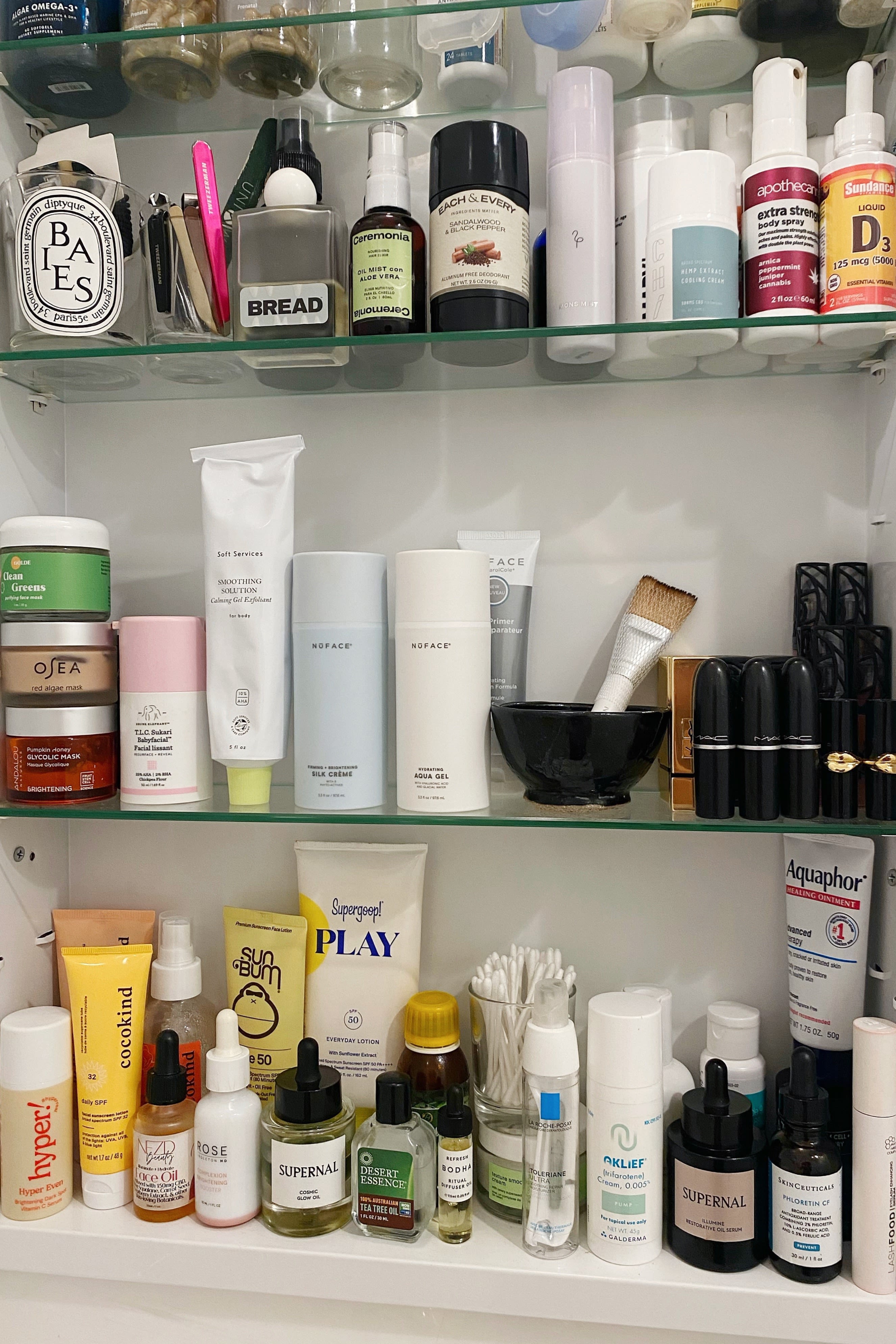 In the morning, I rinse my face with cool water and follow with Neostrata Oily Skin Solution. That’s my daytime exfoliant. After that, I add Skinceuticals Phloretin CF to help brighten any dark spots. My cheekbones are one of my favorite features, and to keep them looking sculpted I do at-home microcurrent treatments with my Nuface most mornings. They have a couple different ionized activators (Aqua and Silk) to use with the machine, and I’ll choose one depending on my skin’s needs and go to town with my Trinity device. Once I’m finished, I apply ‘my glow’: a few drops of Supernal’s Cosmic Oil sealed in with SPF, either Supergoop Everyday SPF 50 or Glossier’s Invisible Shield.