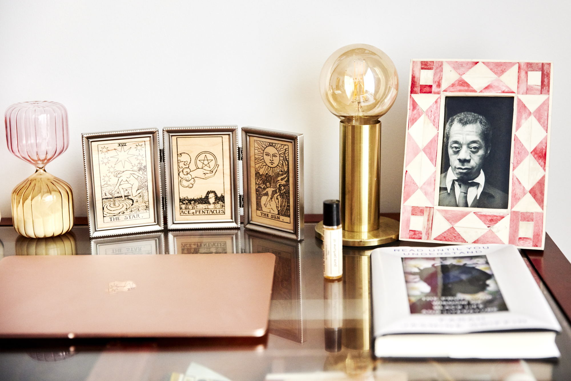 I usually use Glossier’s Stretch Concealer in G2 under my eyes and around my face instead of foundation. Then, I’ll set that with either Elf Translucent Powder or this Black Radiance Soft Focus pressed powder in Creamy Bronze that I’ve had for a long time. I use Glossier Boy Brow, and then I’ll do eyeliner. You know how the girls are doing squiggles [on their eyes]? I want to get in on that, but I’m too shy. I wish I was better at makeup. What I do know how to do is put on lipstick. When I was younger, my mom would say, ‘Don’t wear red lipstick because it looks garish on dark skin.’ But as soon as she said that, it made me want to go out and buy all the red lipsticks. I actually think that bright lipsticks and really bold, dark lipsticks look really cool with dark skin tones. And especially because I don’t know what to do with everything else, makeup-wise, lipstick has always been a way to feel like I’ve put a look together. There’s a brand called Tanaïs that makes great lipsticks—Dianthus is a really beautiful true red. I like this Maybelline Super Stay Matte Ink Lip Color in Protector, a really dark red, almost chocolate-y color. And I really like MAC’s Matte Lipstick in Baby’s All Right [Ed note: discontinued, but Viva Glam II is similar], which is a brown-y pink color. I like to put a MAC lipgloss in Explicit over it, so it kind of looks like my lips, but with pizzazz.