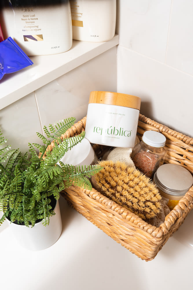 The Nécessaire Eucalyptus shower gel I love because it has such pretty packaging. There’s also this República exfoliating sugar scrub that I’ve been using a couple times a week to exfoliate my body in the shower. I have KP, and I’m excited to work on a product to fix that. And when I get out I love to use Summer Fridays Summer Skin lotion. It is so nourishing, and truly feels like a sensorial experience. My friend is developing her own deodorant so I’m testing one for her right now. It’s aluminum free, and… I’m trying to do it, but it’s an adjustment. Every time I go to her house, I’m like, ‘Tell me if I smell! I need to know.’ I usually just use the Dove spray. And I love the Supergoop sunscreen spray for my body.