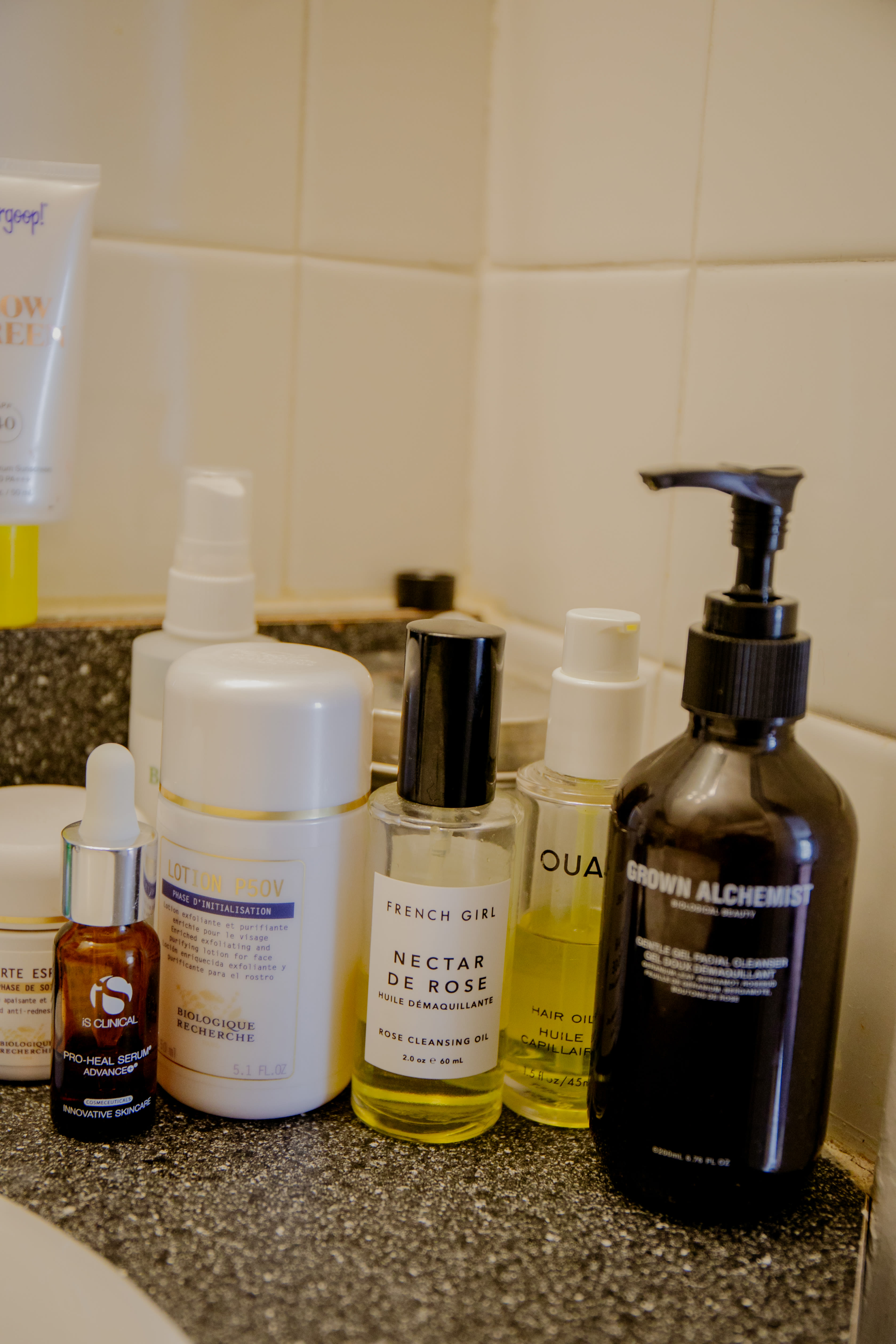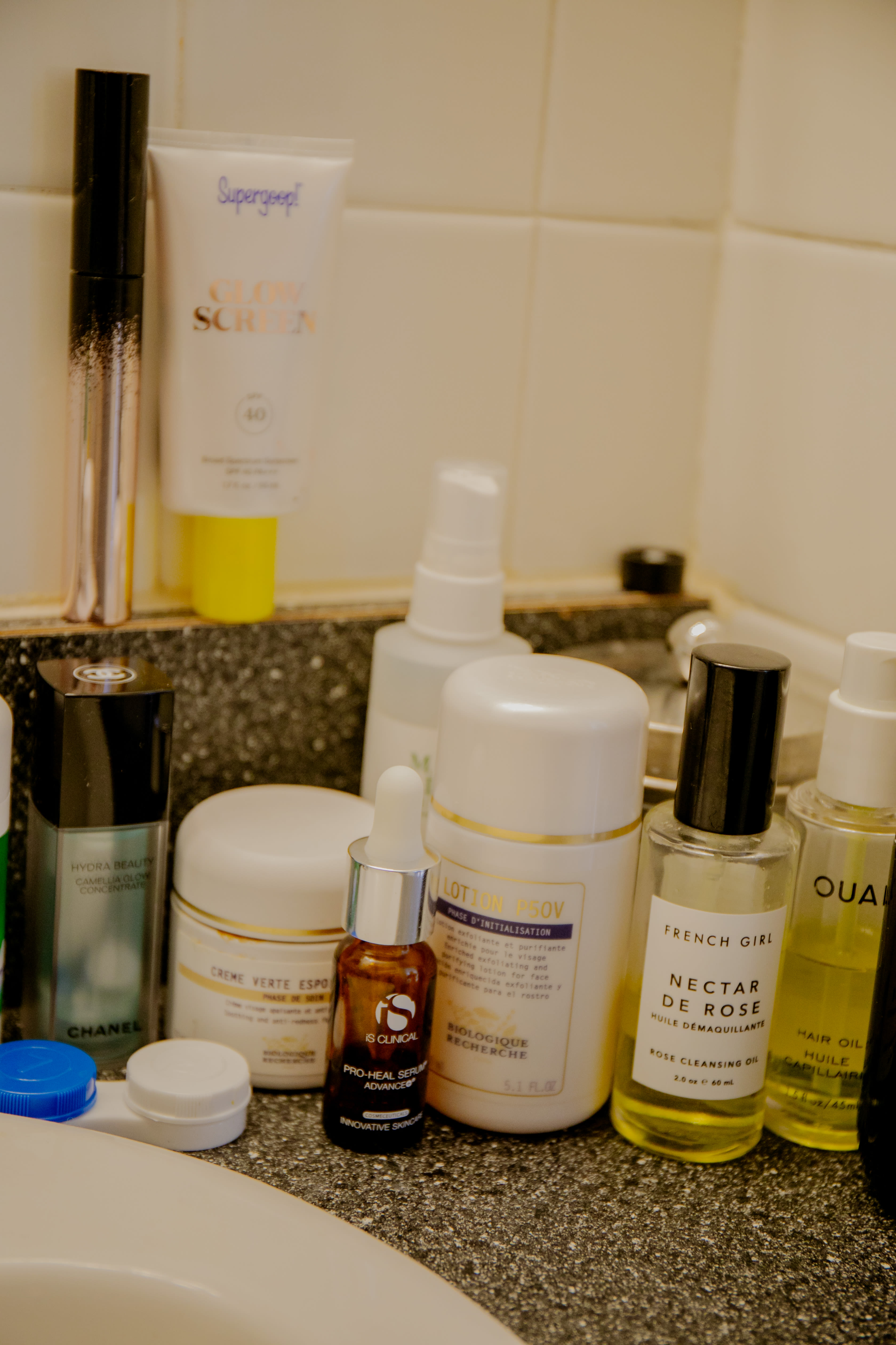 I have a working from home routine, and I have a going into the office routine. Going to the office, I wake up and I start to think about what I’m doing that day, what kind of appointments I have, what kinds of meetings I have, and things like that. I take a shower pretty quickly when I wake up. I do a double cleanse, so I do an oil face wash and then I do a more soapy face wash. I use French Girl Beauty Oil Cleanser. I’m a sucker for a pretty bottle, and I like things that look medicinal. I like things that look and smell like in the 1920s, a doctor smoking a cigar would be like, “This is quite good for you!” The French Girl Beauty, to me, looks sort of like that. Then, I use this cleanser by Grown Alchemist. My skin tends to get a little red, probably because I don’t drink enough water, so I’ve found that it’s actually quite good at calming my skin. I’ve recently switched to a spring moisturizer, which is a moisturizer by iS Clinical and their Pro Heal Serum, which is what my facialist at Rescue Spa recommended. Then, I have a Biologique Recherche Creamthat also reduces redness, which I’ve found to be super effective. In between doing all of this, I am mainlining enormous glasses of ice water. Then, I put on sunscreen. I use Supergoop—sometimes I use the tinted one, which is really great. It gives you a nice glow. Then, sometimes I use the invisible one, which is also pretty good. Then, I get dressed and I go into the office.