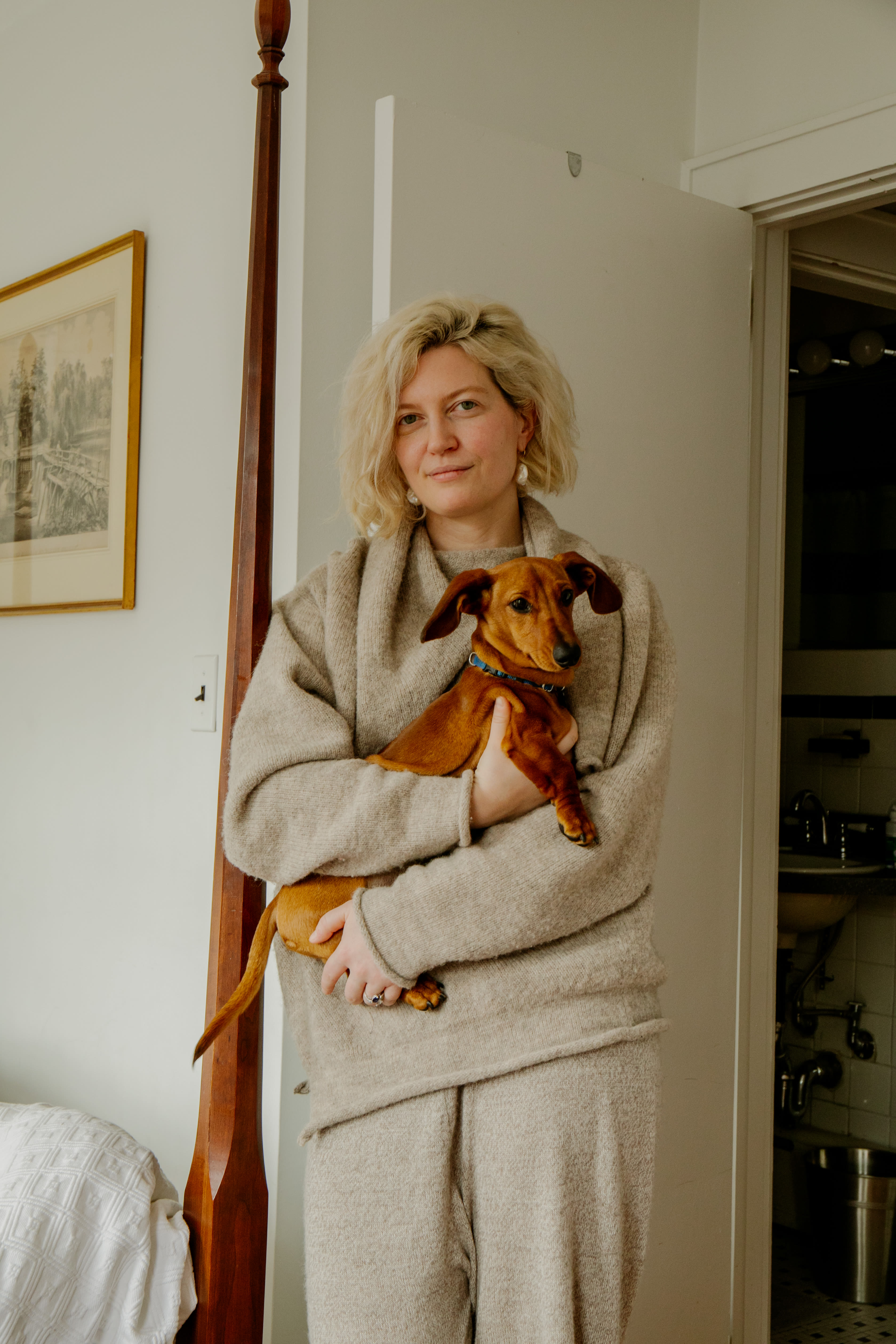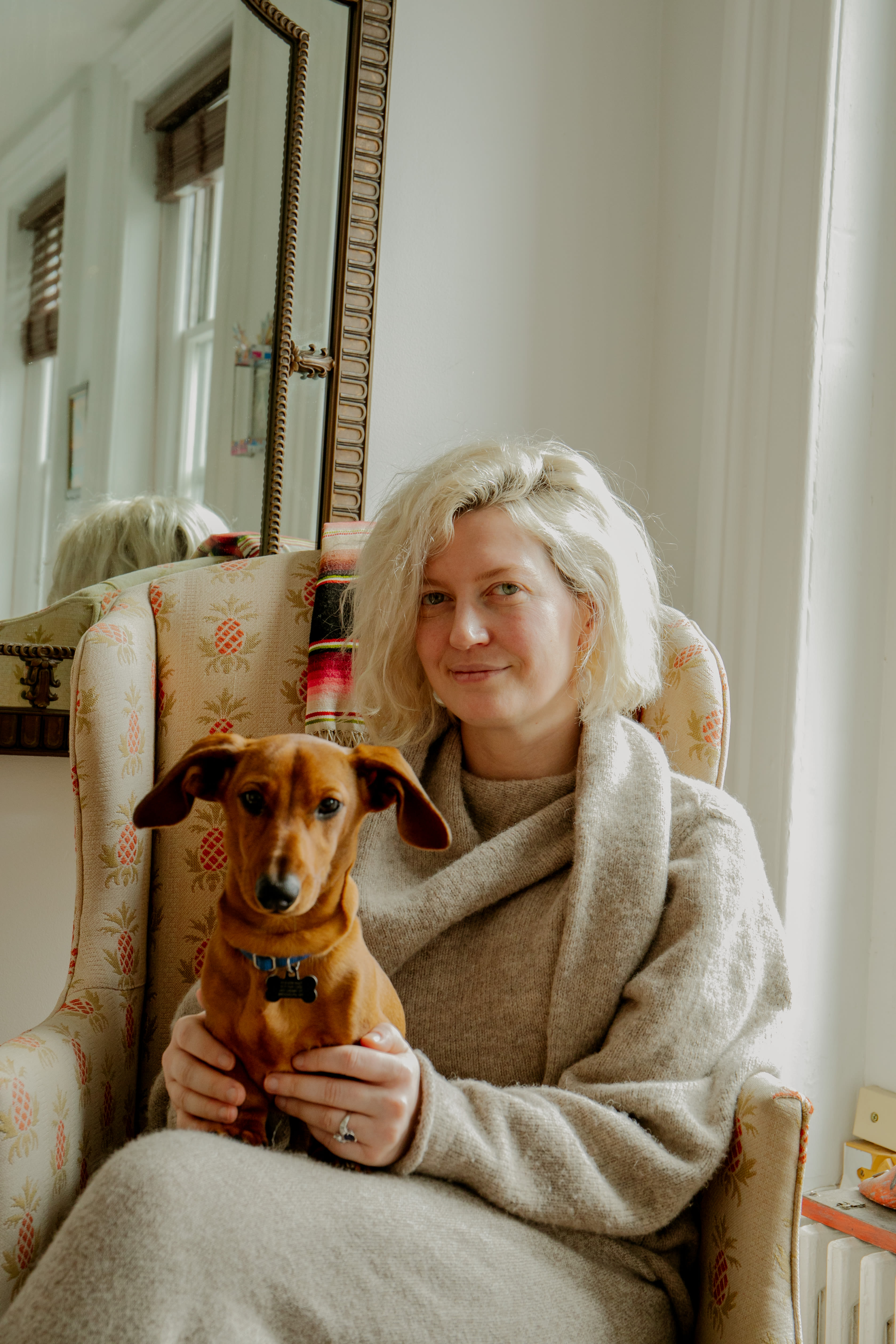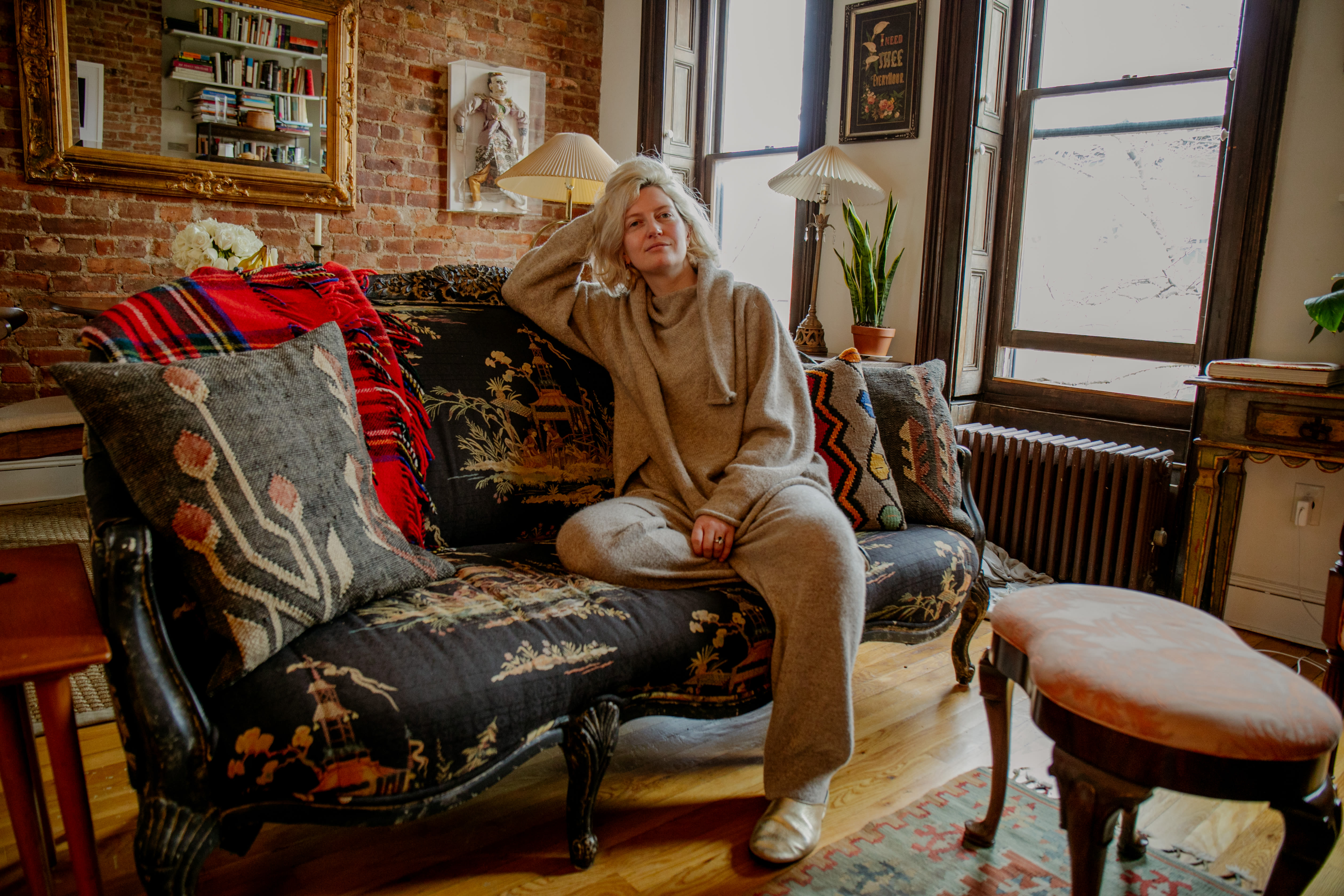 I always really wanted to bleach my hair since I was a teenager. There was this photo of Dree Hemingway from like 2008 or 2009 where her hair is giant, long, bleach blonde, and she has streaks of pink in it. That left this huge impression on me, and I was constantly taking it to colorists when I was in college, saying, “Can you please do this to me?” And they would always say “No, you can’t bleach your hair, it’ll destroy your hair,” and then I moved to the big city, and I went to Fringe Salon, which at that time was very close to where I lived on the Lower East Side. I told the owner of the salon, Amy, that I’d always wanted to bleach my hair, and she was like “Well why don’t we just do it?” This was ten years ago at this point, so I’ve been bleaching my hair ever since. I’ve done it a little grayer, a little more purple, and now I’m sort of in this very dewy, honey color, and I still go to Fringe Salon to get it done. I try to go every five weeks, because it can look kind of cool grown out and with a lot of root to it, and during the height of the pandemic, of course, that is what it looked like, and it looked really badass, I have to say. But now, I sort of like having a bit of polish to it.