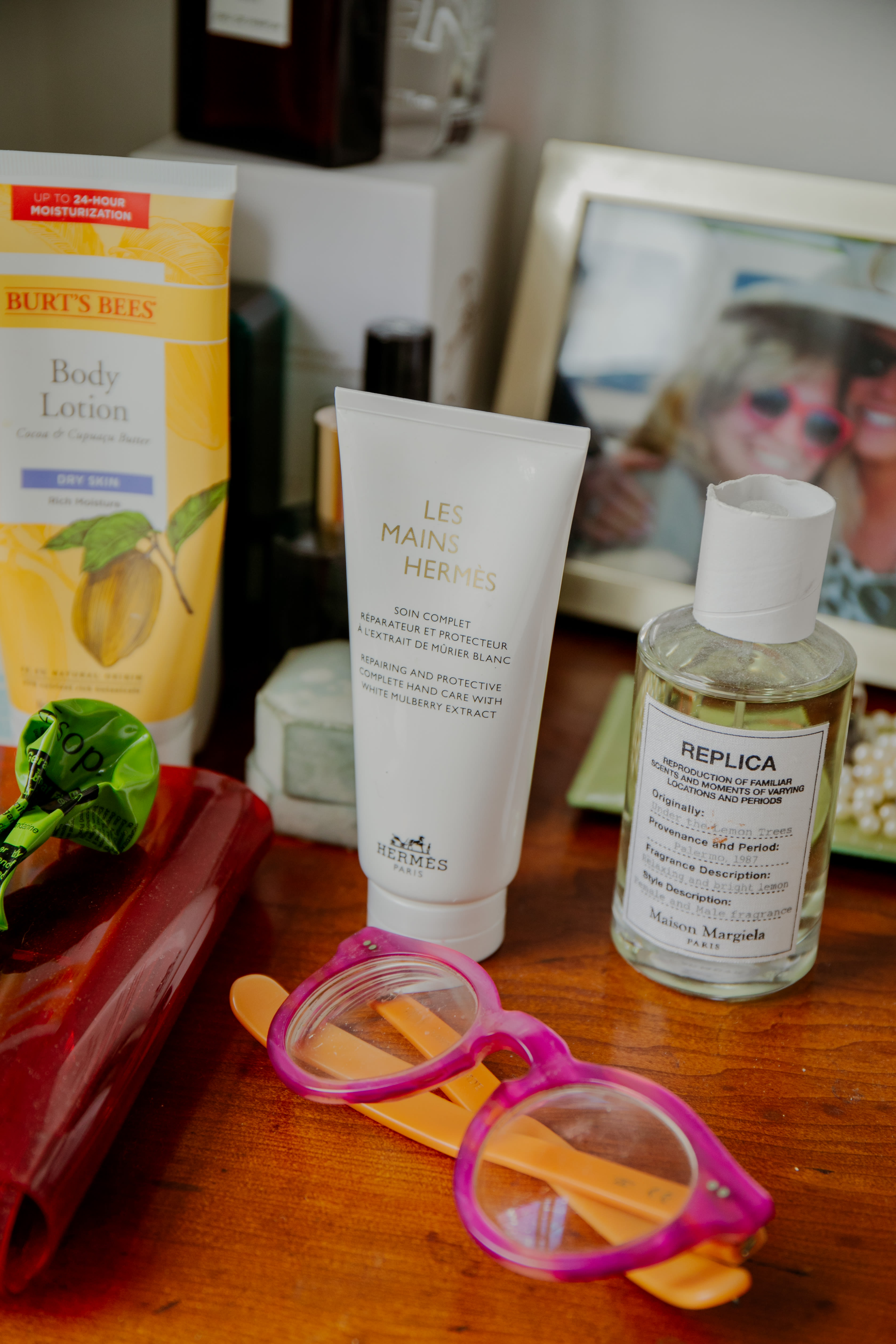 I always use a lotion. Right now, I’m using an Aesop lotion that’s geranium scented. I bought it, of course, going back to the attraction to these packages. It comes in that really old-fashioned metal tube, which is what toothpaste came in when toothpaste was invented. Sometimes, if my skin feels really dry, I’ll put body oil on top of that.