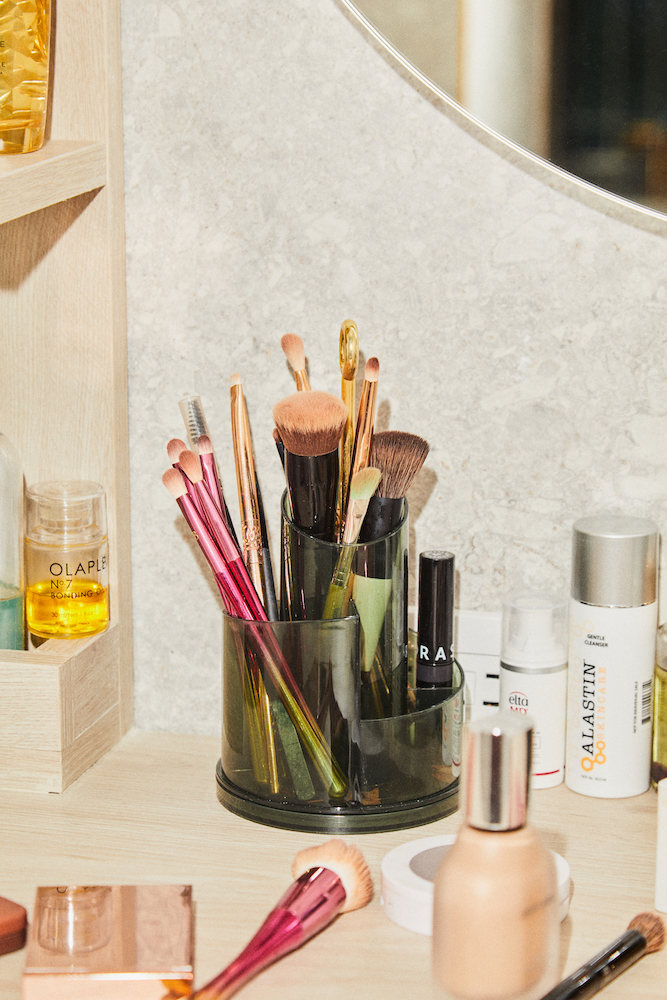 I like to mix Drunk Elephant’d D-Bronzi Anti-Pollution Sunshine Drops with the Haus Labs Triclone Skin Tech Foundation—I use shade 200 Light Medium Neutral—especially if I’m a little tan. The foundation feels so light on your skin and you don’t need a lot of it, so it never feels cakey. I have zero complaints. For bronzer, I like to use the Makeup by Mario Soft Sculpt Shaping Stick in Medium. I like to wear it on my forehead and sometimes on my neck. Honestly, I don’t know if I’m using it correctly, but if it looks good, I guess it works. [Laughs]