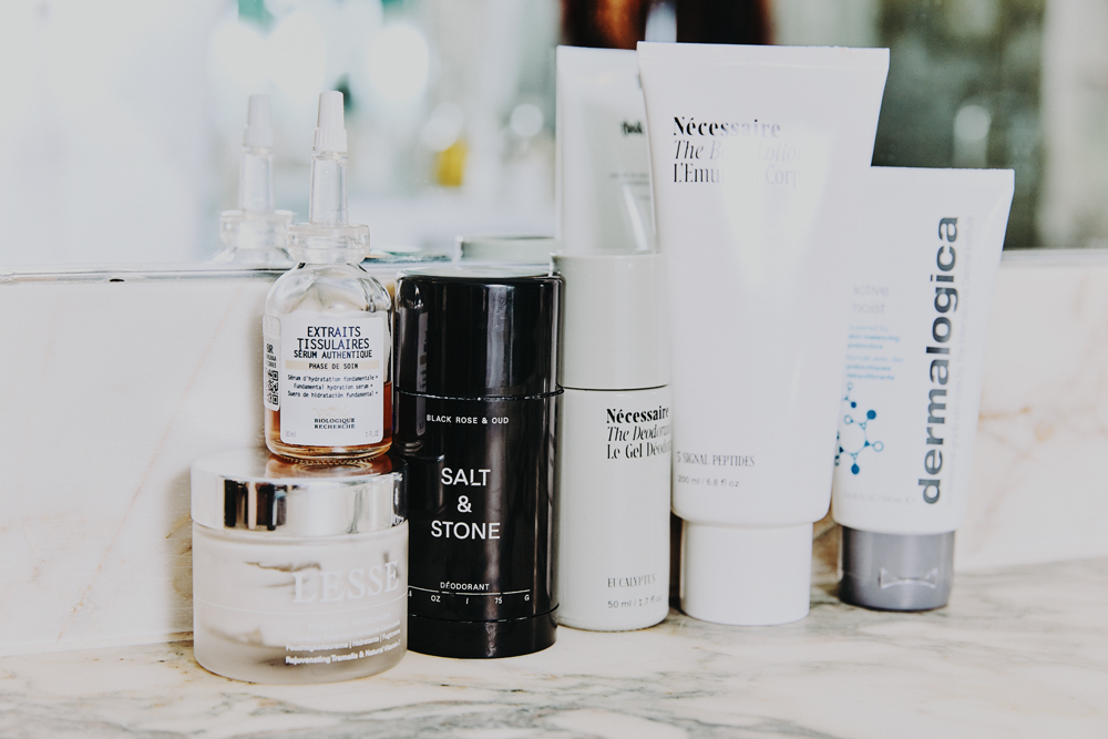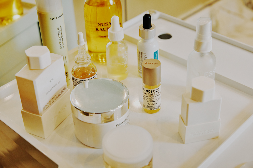 Lesse’s Regeneration Mist is so refreshing. I like to spray it on my face and body. But I use Epi.Logic’s Even Balance Toner a lot, especially after a long night. I’m obsessed with Biologique Recherche’s Serum Extraits Tissulaires, too. I really see a difference when I don’t use it. My skin feels drier and just off. I recently started using In Fiore’s Veloutée Complexe. It’s this really light eye and lip serum. Makeup goes on so smoothly after I use it, but it’s also great before going to sleep. Then, if I want a lighter moisturizer, I grab Dermalogica’s Active Moist. But if I need something a little heavier, I like Lesse’s Essential Moisturizer.