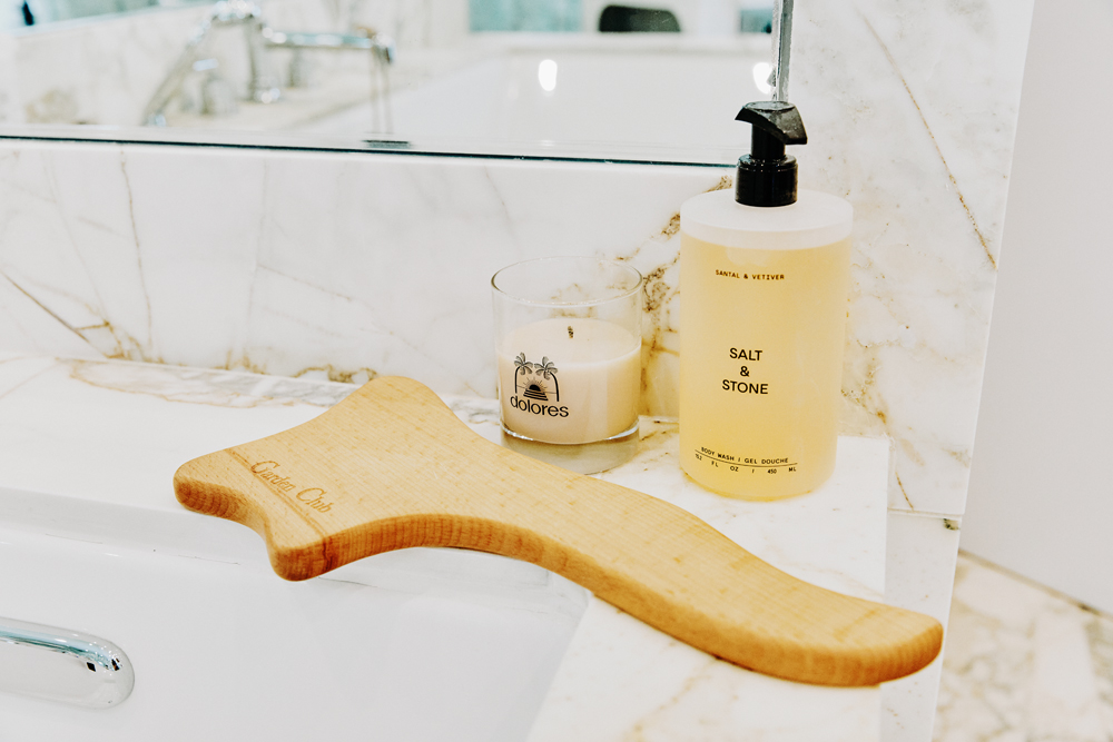 Soft Service’s Buffing Bar is amazing. I use it if I want to feel really fresh. Out of the shower, I love Nécessaire’s body lotion. It’s easy and really hydrating. I usually use the unscented one, but I like the eucalyptus one, too. I also use Nécessaire’s deodorant. I go back and forth between that one and Salt & Stone’s black rose and oud deodorant. I was really shy about using natural deodorants for a long time. I felt like they weren’t going to work so I didn’t want to chance it, but I even use them in Cayman now. And I have to say that the Soft Services Theraplush hand cream is so good—I use it every night.