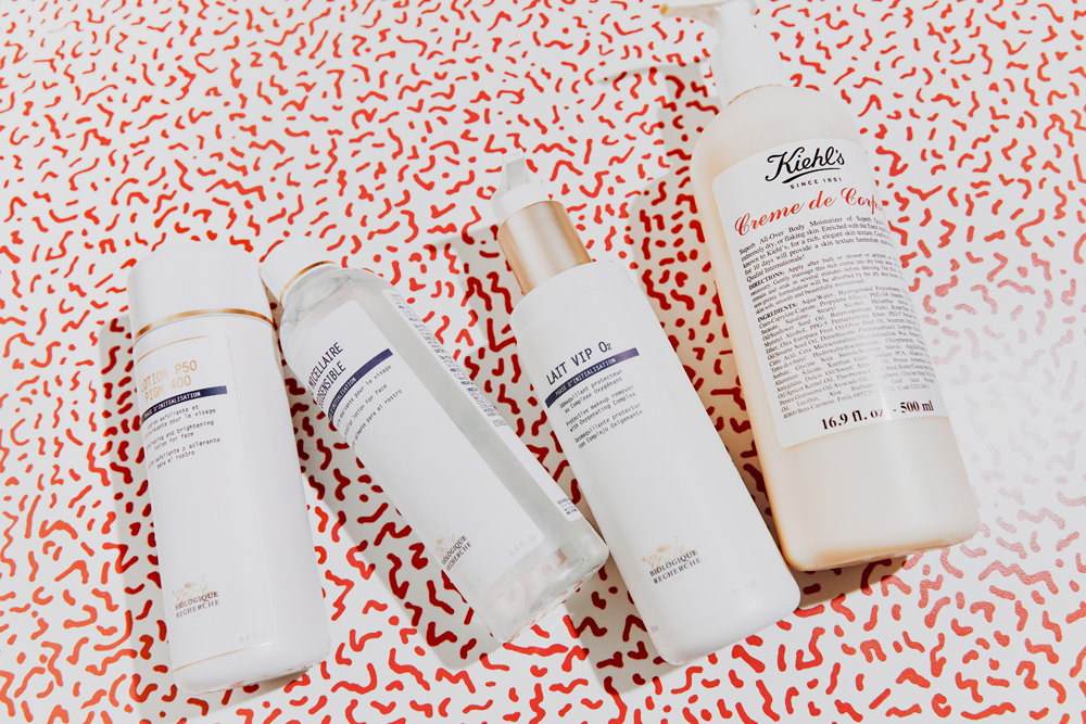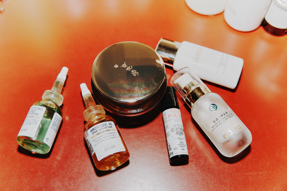 I do a full skincare routine before I go out. The first thing I use is Biologique Recherche’s micellar water, followed by their cleansing milk VIP O2. The cleansing milk has a great slip, so I like to use my gua sha with it. Double cleansing has been great for me. My pores look a lot smaller since I started doing it. Then I use either Aēsop’s Lucent Facial Concentrate, which is a really good vitamin C, or Ranu’s Copper Brightening Serum, which my facialist, Kristyn Smith, recommended. I also really like Biologique Recherche’s Oligo-Protéines Marines for brightening. And I love their Amniotique VG Sérum for hydration and the Lotion P50 PIGM 400 for exfoliating. I feel like my face looks tighter after I use it. For eye cream, I really like Officine Universelle Buly’s Vide Poche. It has more of a serum consistency and comes in a roll-on.