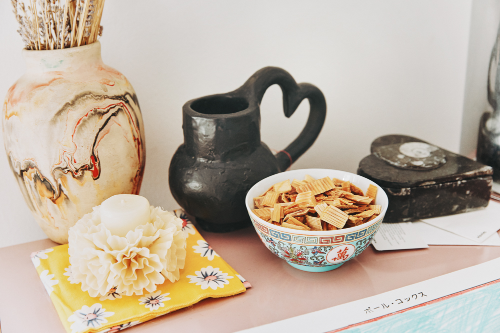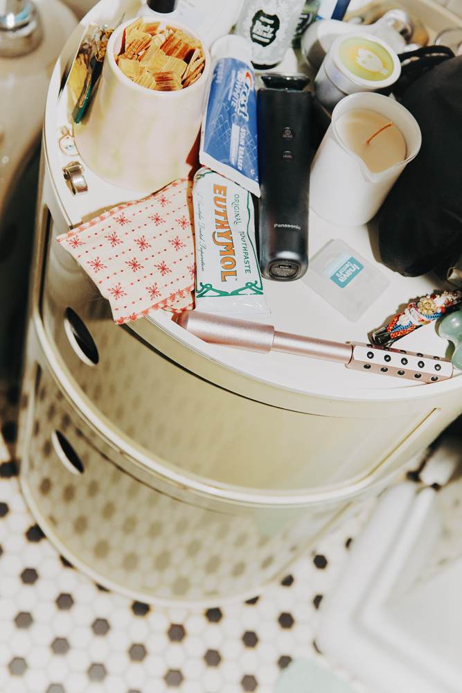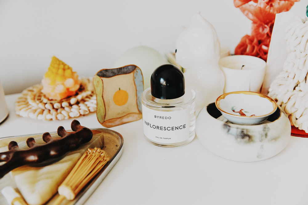 I like feminine perfumes with a twist. Like, I want a floral but not straight on. Byredo’s Inflorescence has that vibe. It has rose petals, lily of the valley, and magnolia, but it’s not overly sweet. I also wear Gold Leaves from Régime des Fleurs. It’s very unique, still floral but it also has amber and cardamom. Angeli di Firenze from Santa Maria Novella is also really nice, but that one’s more fruity. When it comes to candles, I turn to Hawthorne, which was co-founded by one of my friends. I really love Aromatic and Woody and Botanic Blur. Otherwise, I’m burning Ptolemy Aromatique from Aēsop.”