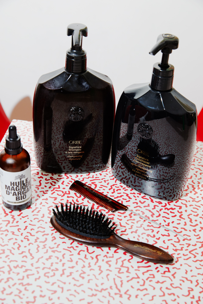 I usually wash my hair once a week. I like Oribe’s Signature Shampoo and Conditioner. I love the smell, and they make my hair feel luscious. Their Gold Lust Nourishing Hair Oil is my go-to for my ends—I never apply it on my roots—but I also love the Huile Magique d'Argan Bio from Le Jardin de Sidi B. It’s an argan oil I picked up from Morocco. My hair is naturally very straight—I don’t own a straightener—so I just go with it. I just brush it through with a wild boar bristle brush from Officine Universelle. I also use one of their Architect combs to do my center part.