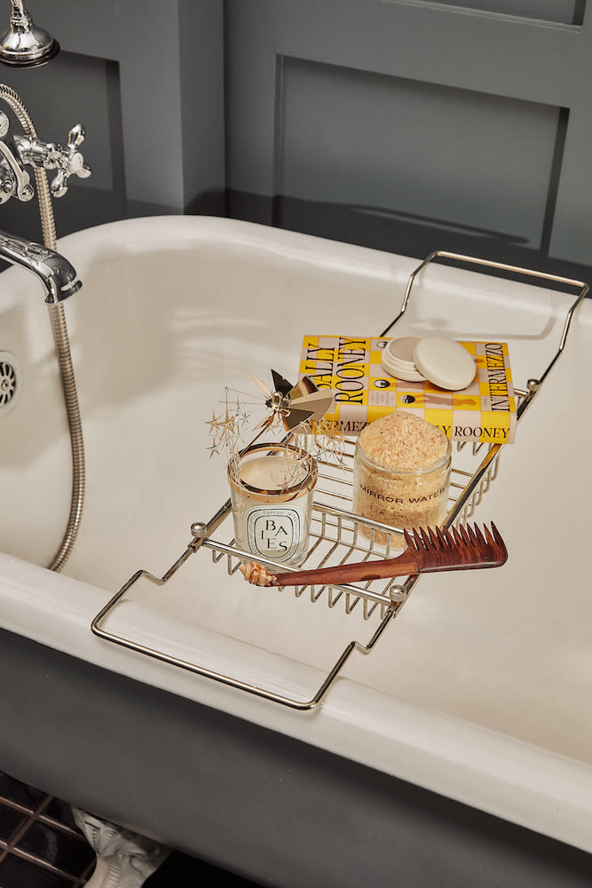 Let us set the scene. You come home after a long day of work so you run a bath and sprinkle in Mirror Water’s bath salts to relax. You want to fully sink into the moment so you turn off the lights and burn a candle—but not just any old candle. You set a match to Baies, the Diptyque classic that combines blackcurrant and roses, and watch as the flame’s heat rotates the carousel delicately perched on top. You could stop right there and watch the stars project onto the wall—or you could take the moment to catch up on Intermezzo, Sally Rooney’s latest, too. After your soak, you detangle your hair with Brother Vellies’ shell comb. Now, you have two options: Pat on Bonjout’s Le Balm, the multitasker that acts as a serum, salve, moisturizer, eye cream, primer, night cream, lip balm, and mask all at once, or take a few extra minutes for Folie’s daily routine, a simple, three-step regimen centered around cleansing, hydrating, and moisturizing. Sound like a dream? You can mix-and-match (or gift all) these goodies to the person in your life most in need of “me” time—or you can buy them all for yourself. That works, too!