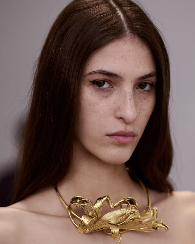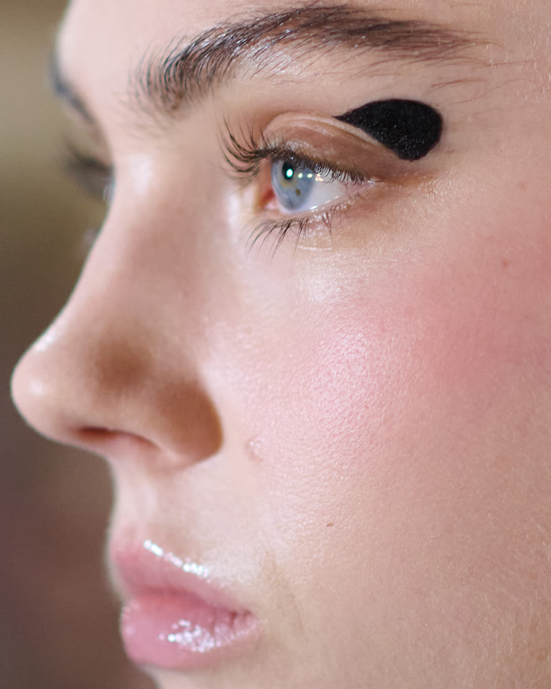 Tresemmé’s hairstylist Mustafa Yanaz and Sisley’s makeup artist Romy Soleimani kept things relatively simple for Ulla Johnson, whose designs were far more intricate with varying textures and gold accents. Yanaz wanted to work with the models’ natural hair texture to create the “best version of themselves.” That meant some wore “wind-kissed waves” while others wore “hidden fishtails,” some of which took three or four times to perfect. Soleimani gave the models blink-and-you’ll-miss-it cat eye wings with either “barely there” or deep mulberry lips. The key to both is to blur the edges of the lips lightly using the tips of your fingers.